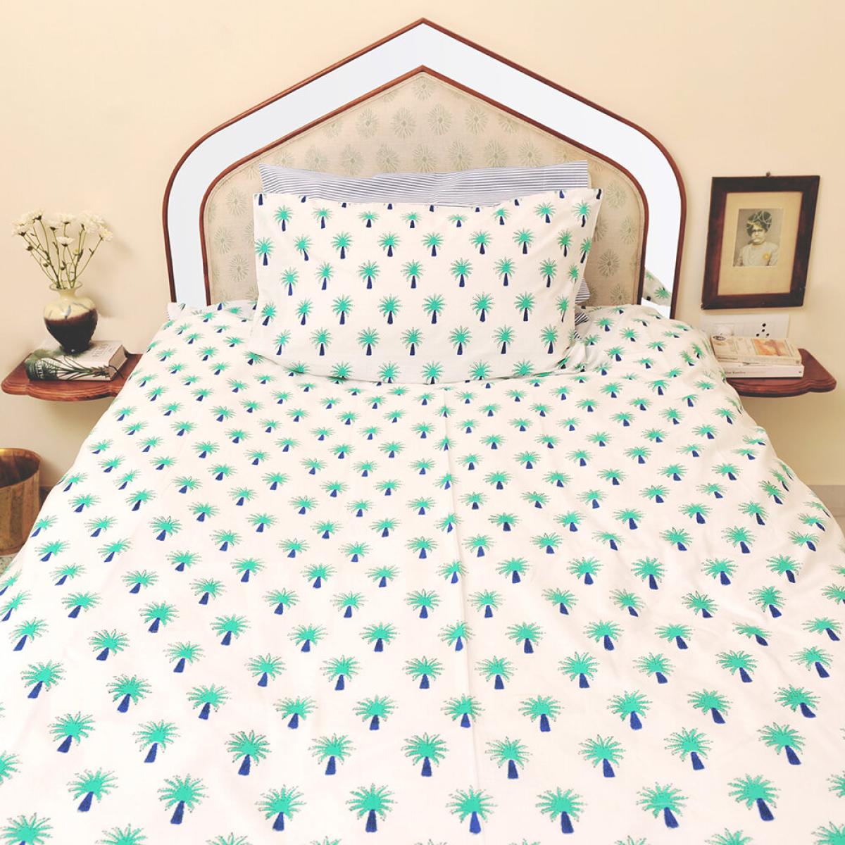 Wake up amongst the palm trees every day thanks to this bedding set from Lulu & Nat. Crafted from super soft percale cotton, it features a vibrant turquoise palm tree print with a blue stripe reverse and is available in several sizes. With top edge stitch detail, it's finished with hidden pearlescent button closings and also comes with its own self printed cotton bag. Due to the hand printing process, Lulu & Nat advise that variations and imperfections may occur in the pattern. Key features: * Bed linen set * Material: 100% Indian percale cotton * Includes: single duvet cover & x1 pillowcase * Dimensions: duvet cover 135x200cm * Pillowcase: 50x75cm * Vibrant turquoise palm tree print * With blue stripe reverse * Top edge stitch detail * Comes in self printed cotton bag * Machine washable at 30 c * Thread count: 200 * British design made in India * With hidden pearlescent button closings * Due to hand printing variations & imperfections may occur