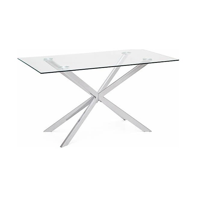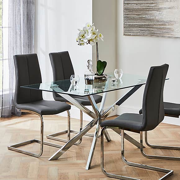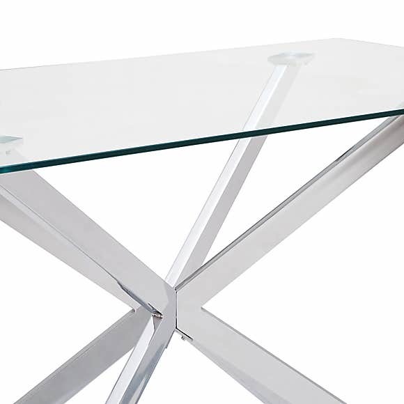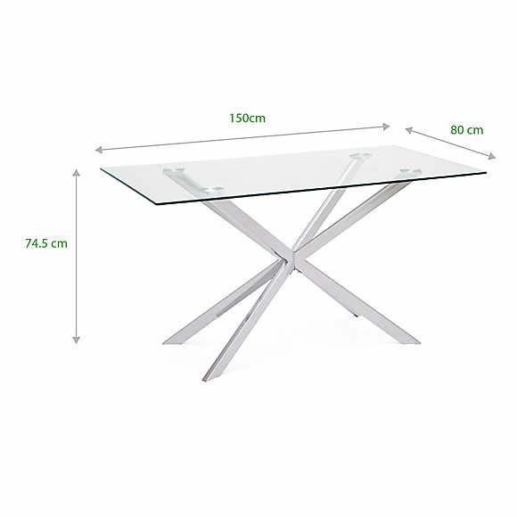Dunelm Exclusive – Designed and Developed by Dunelm. Presenting a modern, elegant design, the Lumia glass table features a clear tempered glass top, complete with a gorgeous chrome-plated, cross base leg design. Offering space to seat up to 6 people, this sleek self-assembly dining table would make a stunning addition to any modern dining space.