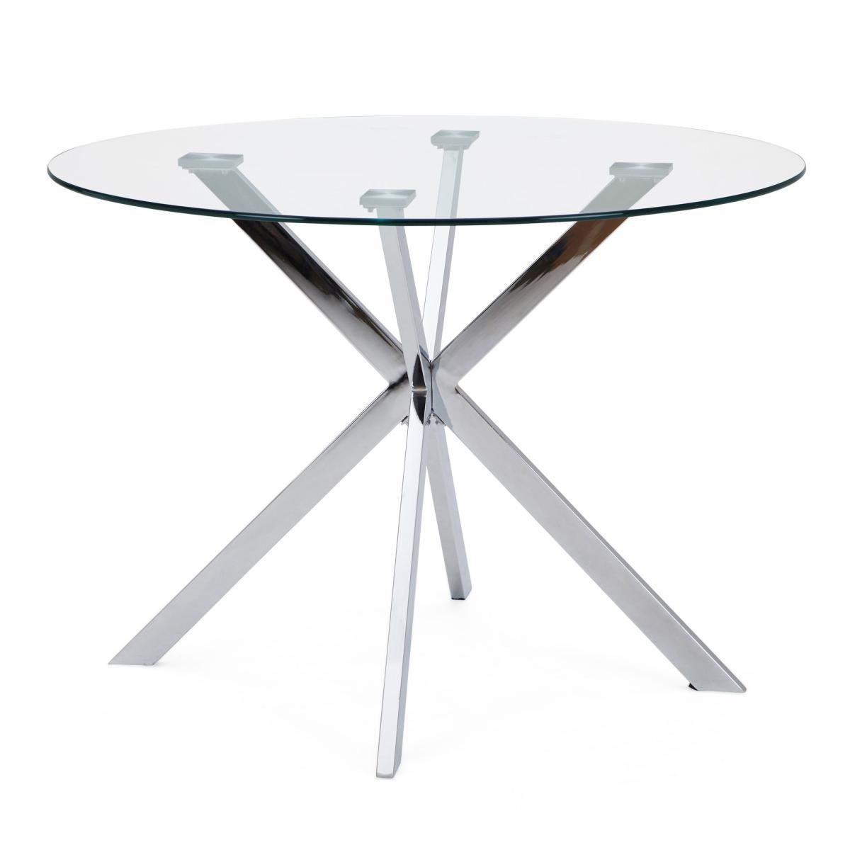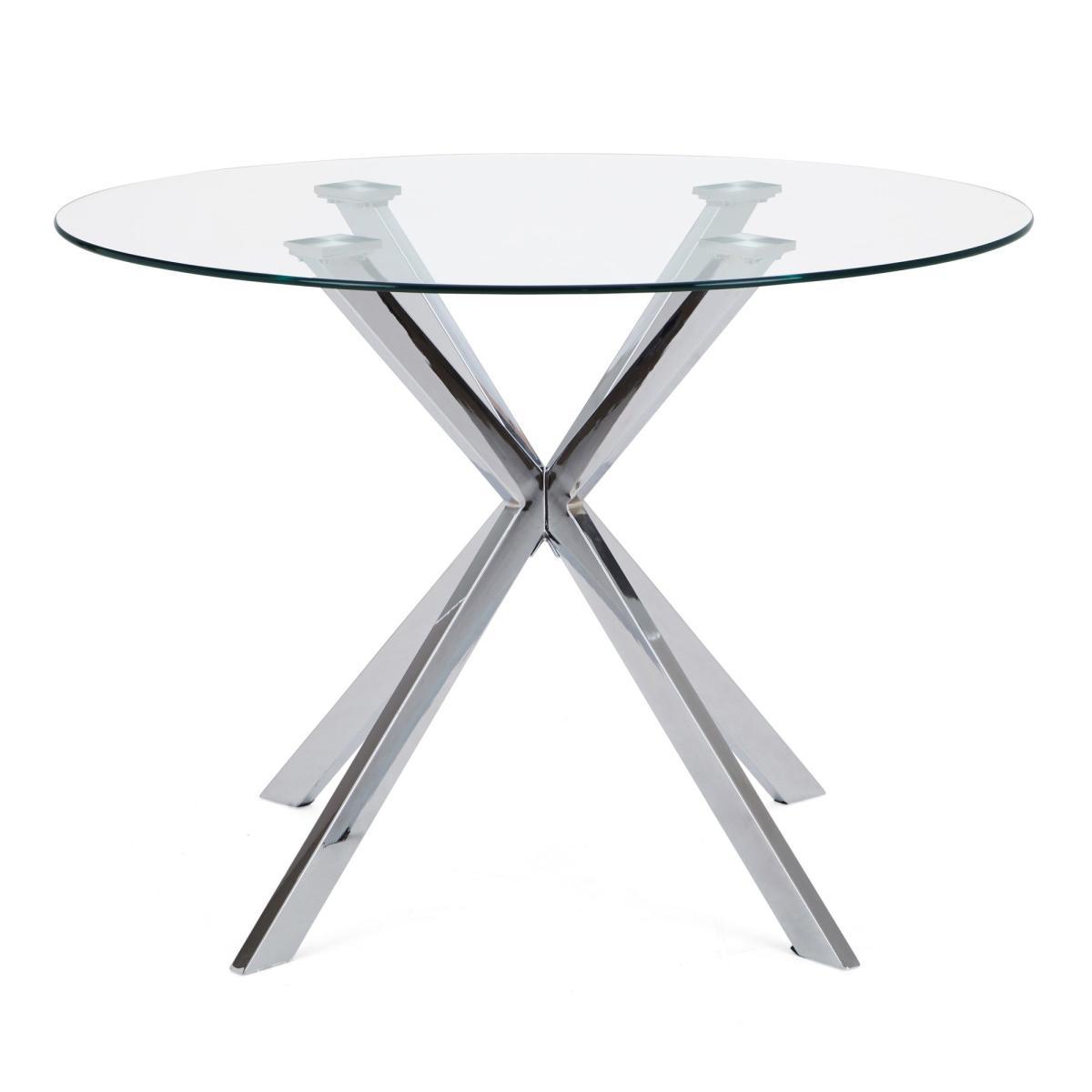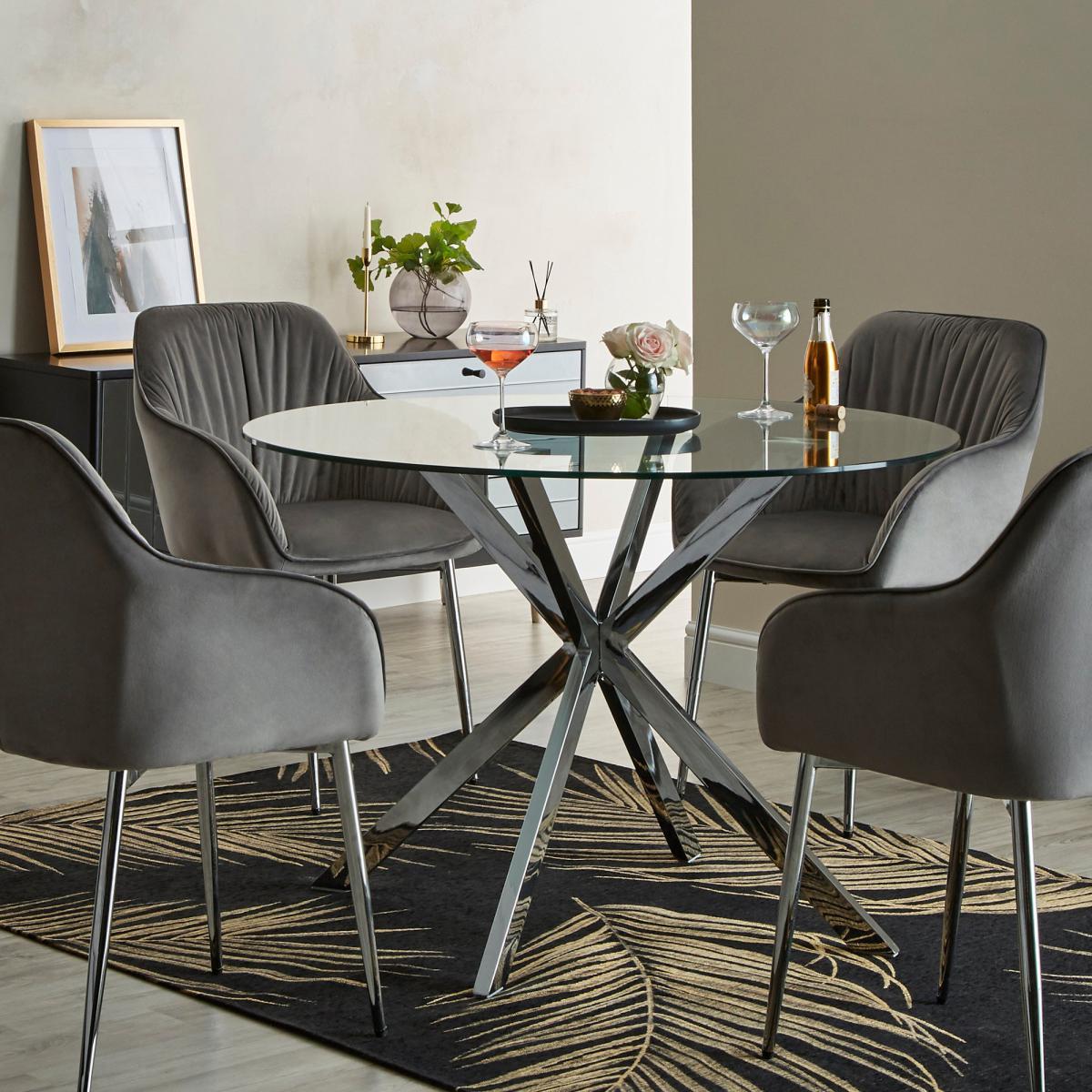 Dunelm Exclusive – Designed and Developed by Dunelm. Presenting a modern, sleek design, the Lumia glass round table features a clear tempered glass top, complete with a gorgeous chrome-plated, cross base leg design. Offering space to seat up to 4 people, this elegant self-assembly dining table would make a stunning addition to any modern dining space.