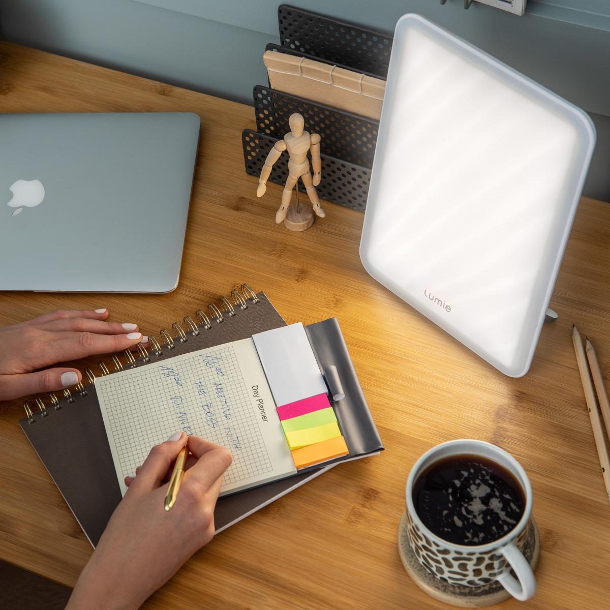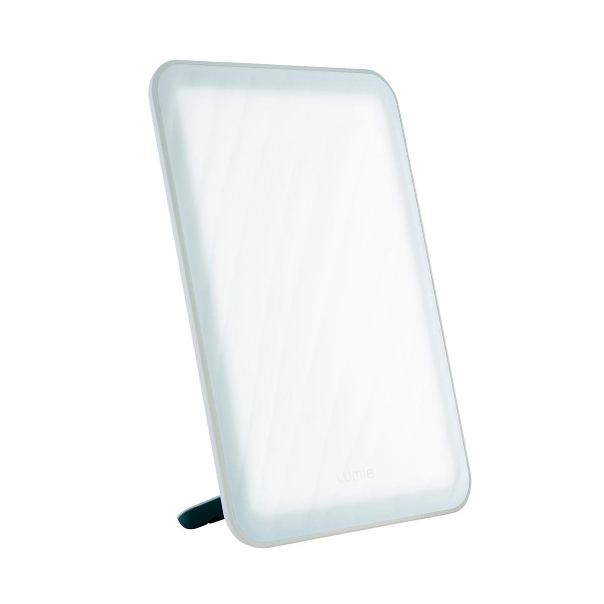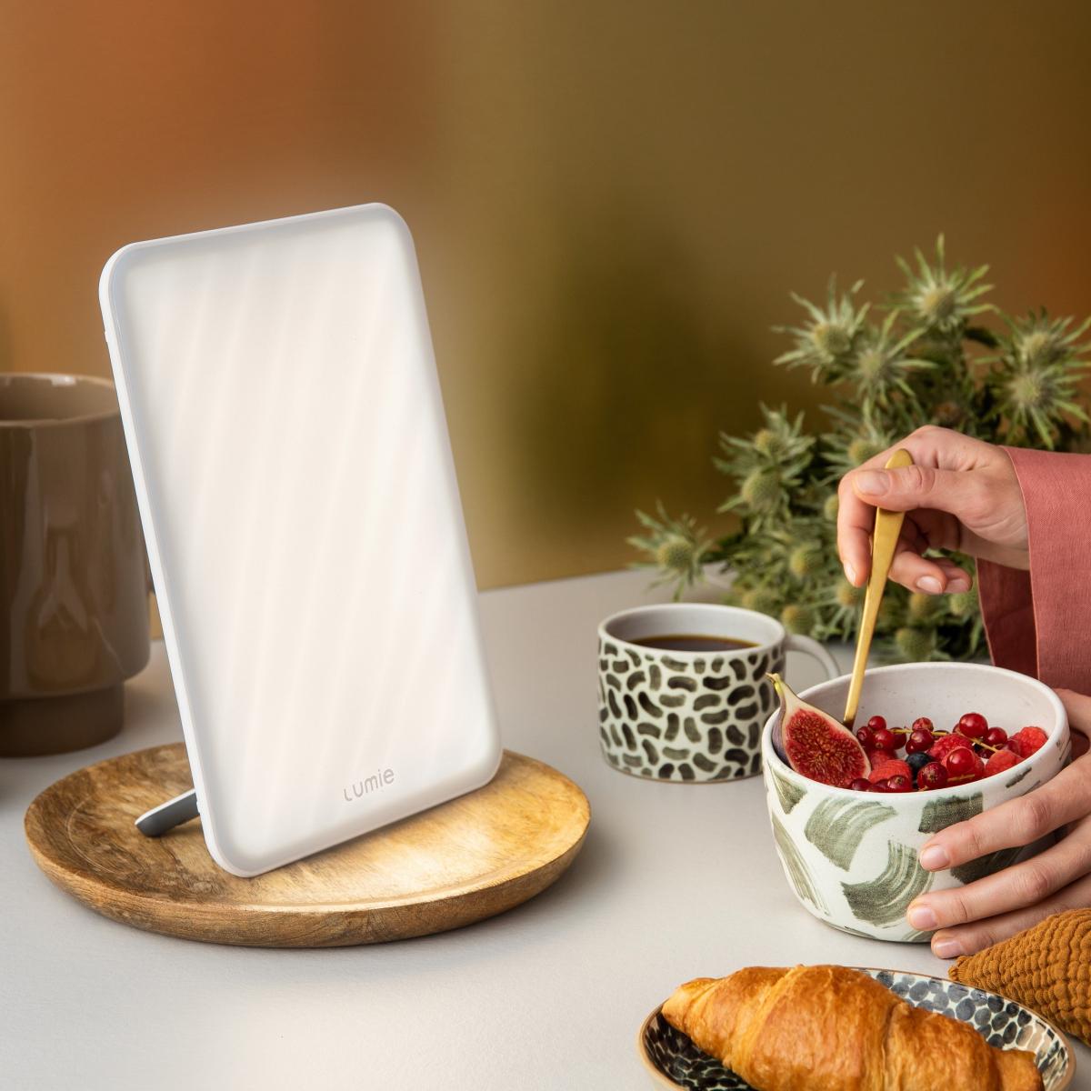 Brighten up your workspace with this table lamp. The Lumie Vitamin L provides a daily dose of light therapy to compensate for a lack of sunshine, particularly in autumn and winter, making it an effective solution for treating symptoms related to winter blues and Seasonal Affective Disorder (SAD). The simulated sunlight helps improve mood, energy, and focus, promoting a better sense of well-being during the darker months. This lamp is designed for convenience and can be used in various settings. Whether you're at home, in the office or studying, you can “recharge your batteries” naturally with 30 minutes of light therapy. Its slim design and portability make it easy to take with you on the go, allowing you to incorporate light therapy into your daily routine wherever you are. Despite its compact size, the Vitamin L delivers high performance. The relatively large screen ensures a sufficient light output, allowing for an effective treatment experience. It can be used in portrait or landscape position, offering flexibility to suit your preference. This lamp features a rippled diffuser that provides a soft and comfortable light, ensuring a pleasant user experience. The device is energy-efficient and UV-free, making it safe and efficient to use for extended periods. The Vitamin L delivers the industry standard 10,000 lux at a distance of 20 cm, ensuring that you receive the optimal light intensity for effective light therapy. The recommended use is 30 minutes at 20 cm, with the option to extend the duration if preferred at a further distance, such as 60 minutes at an arm’s length for example.