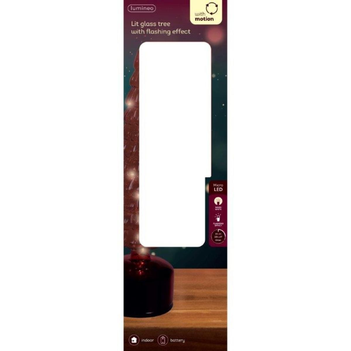 Bring dynamic festive charm to your home with the Lumineo Micro LED Rotating Tree – Red. Crafted from elegant glass, this indoor decoration features a captivating flashing light effect and a rotating base, creating a lively and enchanting display. Key Features: Height: 39cm | Diameter: 11cm Flashing micro-LED lights for a warm, festive glow Rotating base adds dynamic movement and visual interest Battery operated: Requires 3 × AA batteries (not included) Elegant glass design in a rich red finish Perfect for mantels, tabletops, or seasonal displays Why You’ll Love It: This micro LED rotating tree combines elegance with movement, bringing a magical and cosy atmosphere to any indoor setting. Its flashing lights and rotating feature make it a standout piece in your festive décor, perfect for adding charm and warmth to your home.