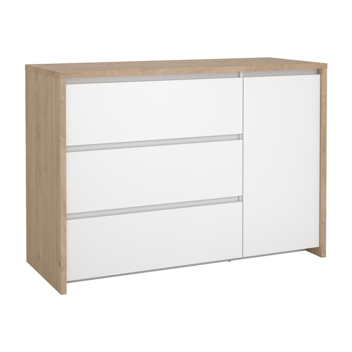 Maximise your storage space with this Lumo Dual Finish Sideboard. Featuring a minimalist yet attractive design, this sideboard adds a contemporary touch to your home interiors. With a blend of Jackson Hickory oak and a classic white gloss finish, this piece of furniture adds a modern edge to your indoors and effortlessly complements an array of decor styles. The sideboard features three spacious drawers and a single door, offering ample storage space to keep your living area organised and mess-free. The clean lines and modern design add an enchanting touch to your bedroom, dining room and even hallways.