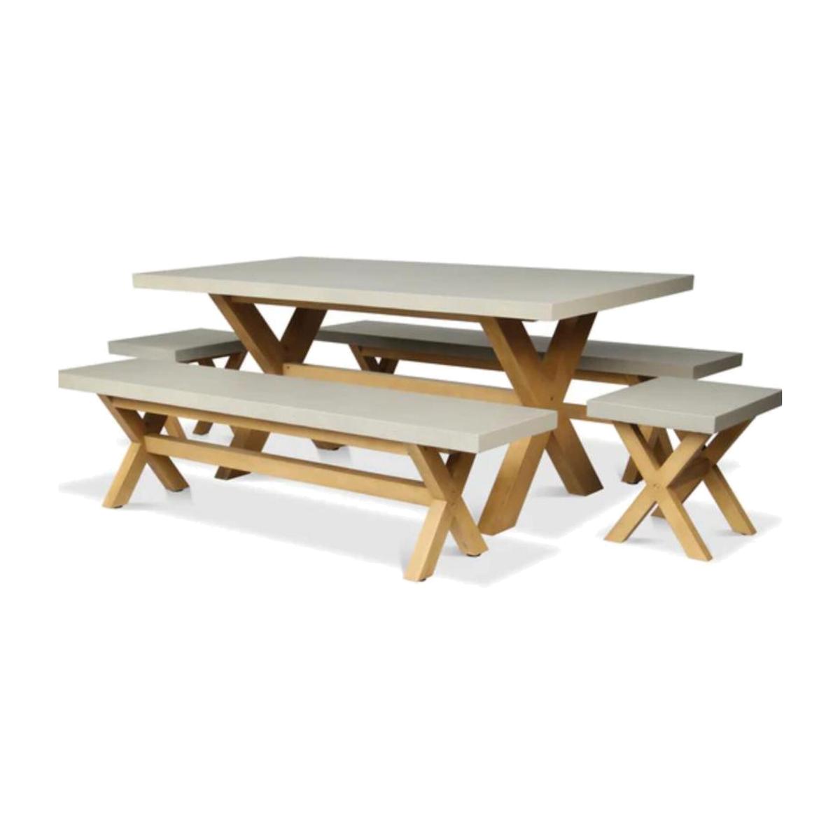 Introducing the Luna 8 Seater Rectangular Concrete Dining Table and Bench Set, crafted from beautiful sustainably sourced Acacia hardwood and lightweight concrete. This practical and durable set is coated with a PU coating, ensuring long-lasting quality. The set comprises of a 180cm x 90cm Rectangular Table featuring a concrete top design, also including 2x Luna Benches and 2x Luna Stools with smooth concrete seating. This set showcases the natural beauty of sustainably sourced Acacia hardwood and lightweight concrete. Its natural tones and exquisite craftmanship make it the perfect choice for creating high quality furniture. The Luna collection sets the standard for outdoor furniture design with its coordinated blend of wooden elements, handcrafted natural rope weave and concrete table tops. FSC 100% certified Acacia wood with a PU coated finish offers a combination of sustainability and aesthetic appeal for outdoor furniture. The 6mm beige polyester round rope weave offers a sleek and modern aesthetic while also providing durability to withstand outdoor elements. Olefin 250gr fabric cushions provide luxurious comfort for extended periods of outdoor relaxation. Olefin fabric is known for its resistance to fading, moisture, and stains, making it an excellent choice for outdoor use. The concrete grey table top adds a modern touch to the garden furniture set and creates a striking visual contrast. The concrete table top is waxed to ensure durability and protects it from the elements. Wax is also supplied with every table purchased.