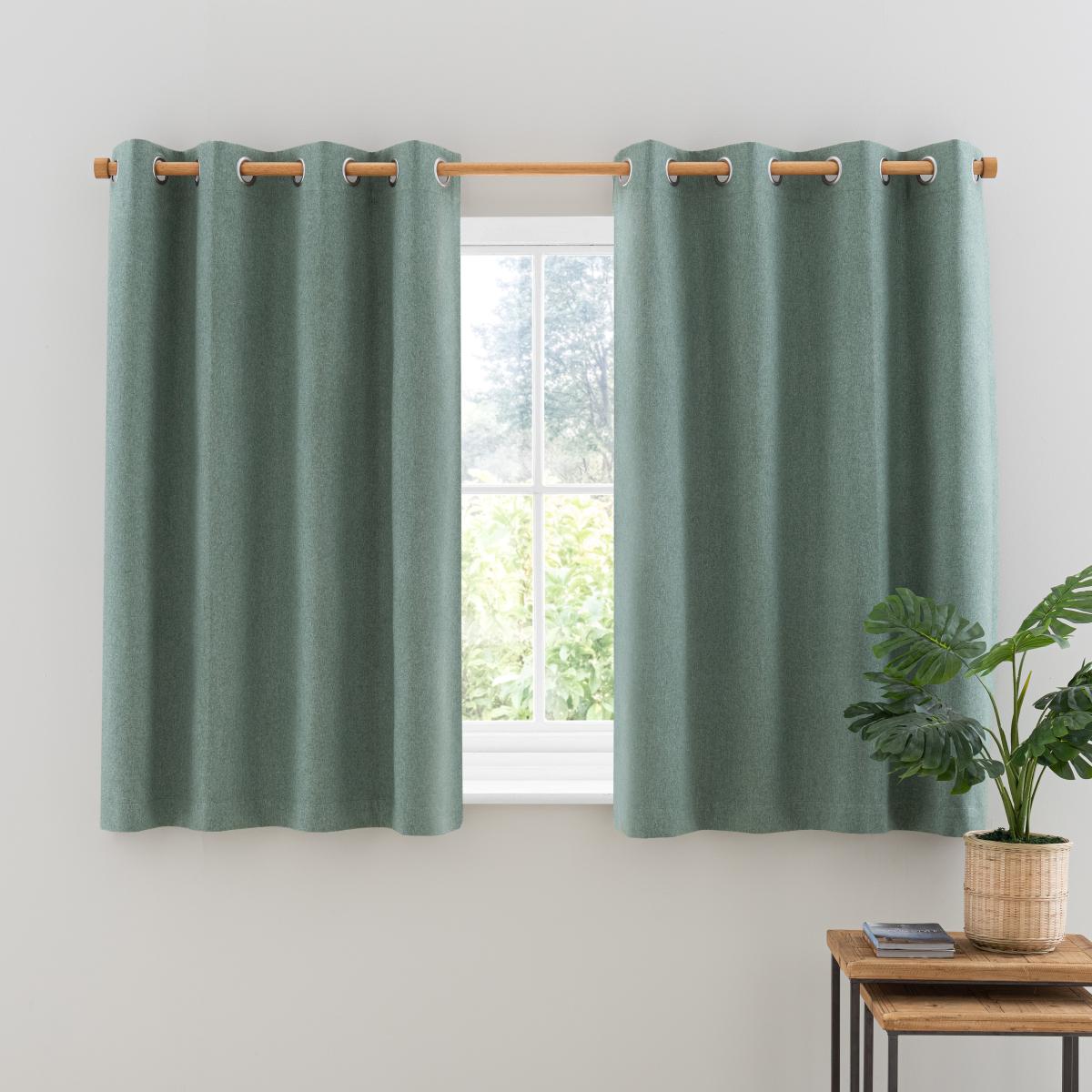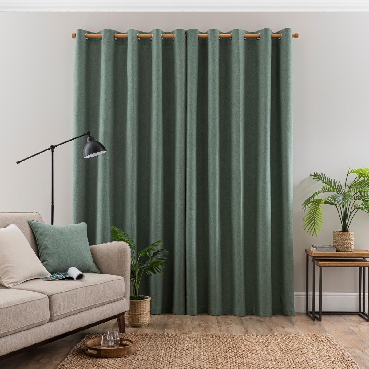 Crafted with a lilypad colourway, these Luna curtains feature a brushed wool effect face fabric that will bring effortless style and sophistication to your home interior. Complete with an eyelet header, these curtains have elegant, loose folds that look stylish within any room. Designed with a blackout coating to stop unwanted light entering your home, these curtains help to ensure a good night's sleep and will provide extra privacy by blocking the view into the room from outside. Temperature smart, these curtains are effective at keeping out draughts in winter and blocking out the heat in summer. It's these thermal properties that make Luna curtains ideal for all seasons. Coordinate the curtains with the matching cushion cover for a stylish room look. Please note:. Pattern matching can not be guaranteed across multiple pairs of curtains. This collection is verified by OEKO-TEX® and independently tested for harmful substances as well as manufactured using sustainable processes under socially responsible working conditions.