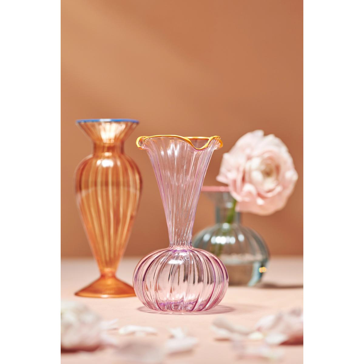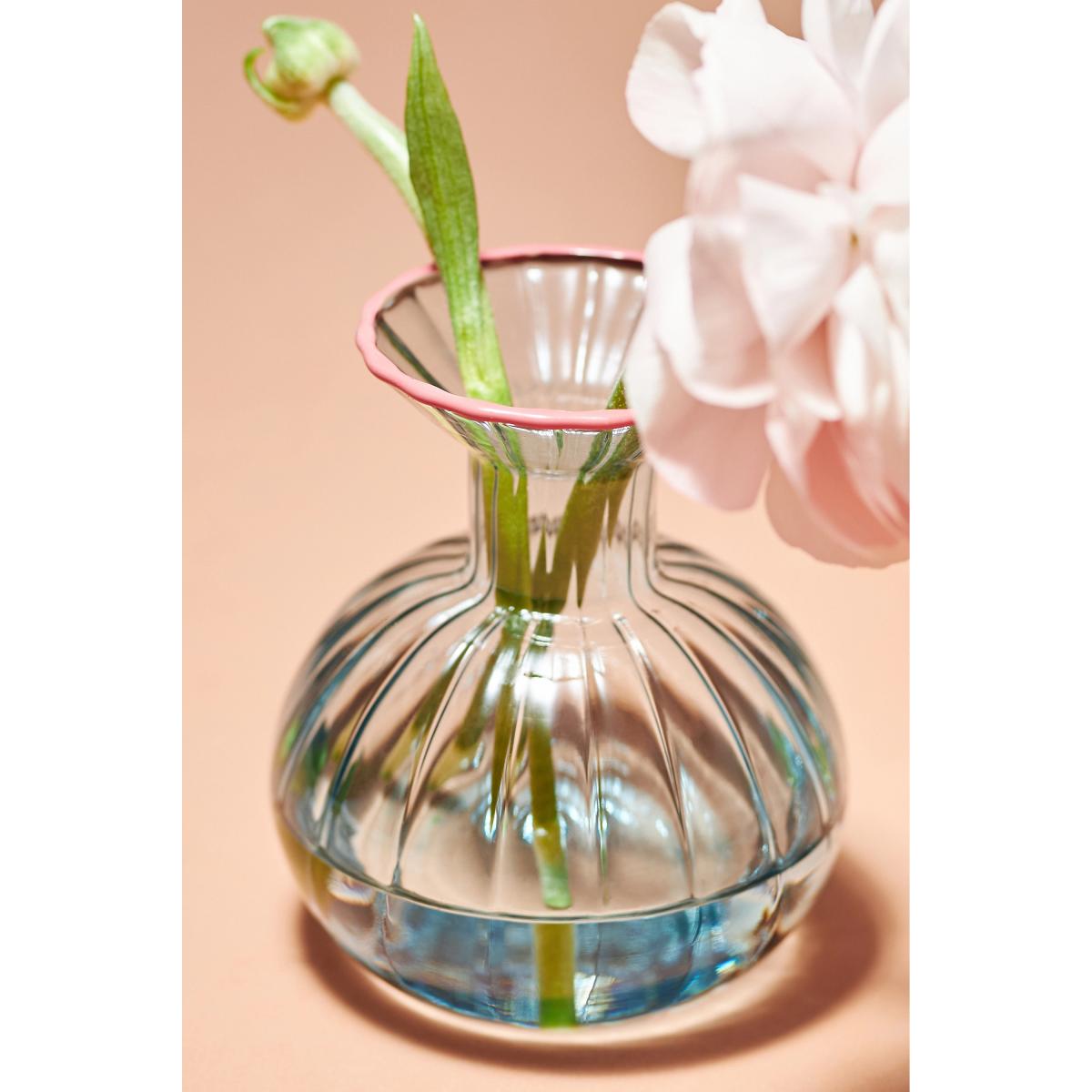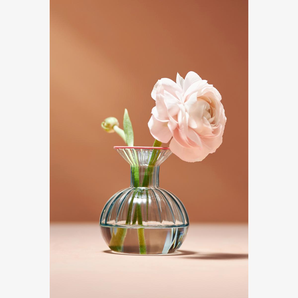 I love this little vase for its compact size and charming design, making it versatile for various interior styles. The clear glass with its rounded shape adds a subtle touch of elegance without overpowering other decor elements. It works particularly well in minimal or modern interiors, where it can hold a single flower or a small cluster to bring a pop of colour and freshness. For practical styling, I suggest pairing it with simple blooms like ranunculus or ranunculus; placing it on a bedside table, shelf, or windowsill allows it to shine as a delicate focal point. Its simplicity and elegance make it an easy upgrade that adds both texture and personality to any space.