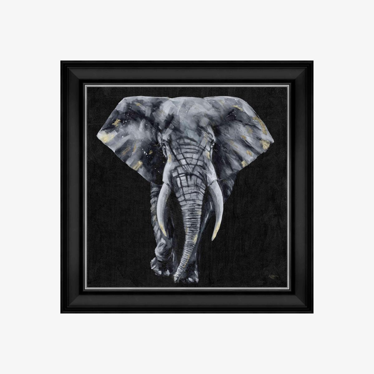 A dramatic monotone artwork depicting a majestic elephant. A striking, expressive piece that’s perfect for a feature wall. Why you'll love it A bold and visually arresting modern artwork. Monotone black, white and grey with metallic gold highlights. Reproduced from original artwork by Louise Luton. Hand-finished with acrylic paint for a dynamic textured look. Ornate premium black frame with inner silver-toned frame accent border. Made in the UK. This framed picture is part of the Furniture Village home accessories collection. What you need to know Supplied with a metal hanging fitting and nylon cord. Indoor use only. Dimensions Height: 96 cm (38 in). Depth: 5 cm (2 in). Width: 96 cm (38 in).