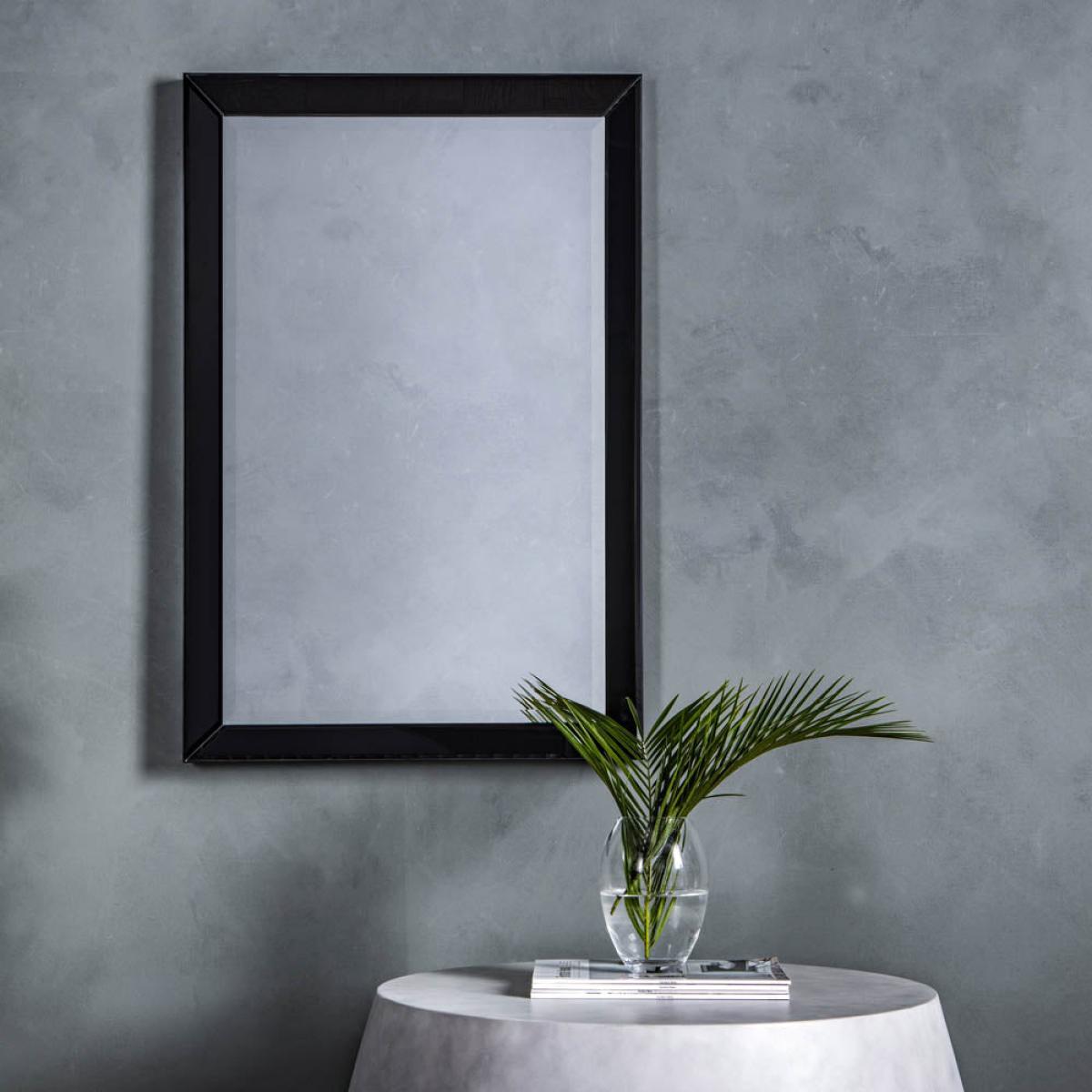 Contemporary, black tinted angled mirror frame that would complement any interior.