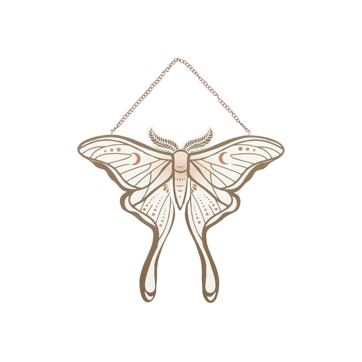 This elegant luna moth-shaped hanging sign adds whimsical charm to any room. A delicate symbol of transformation and mystery, its intricate wings represent timeless beauty. Hang in windows, on doors or across walls.