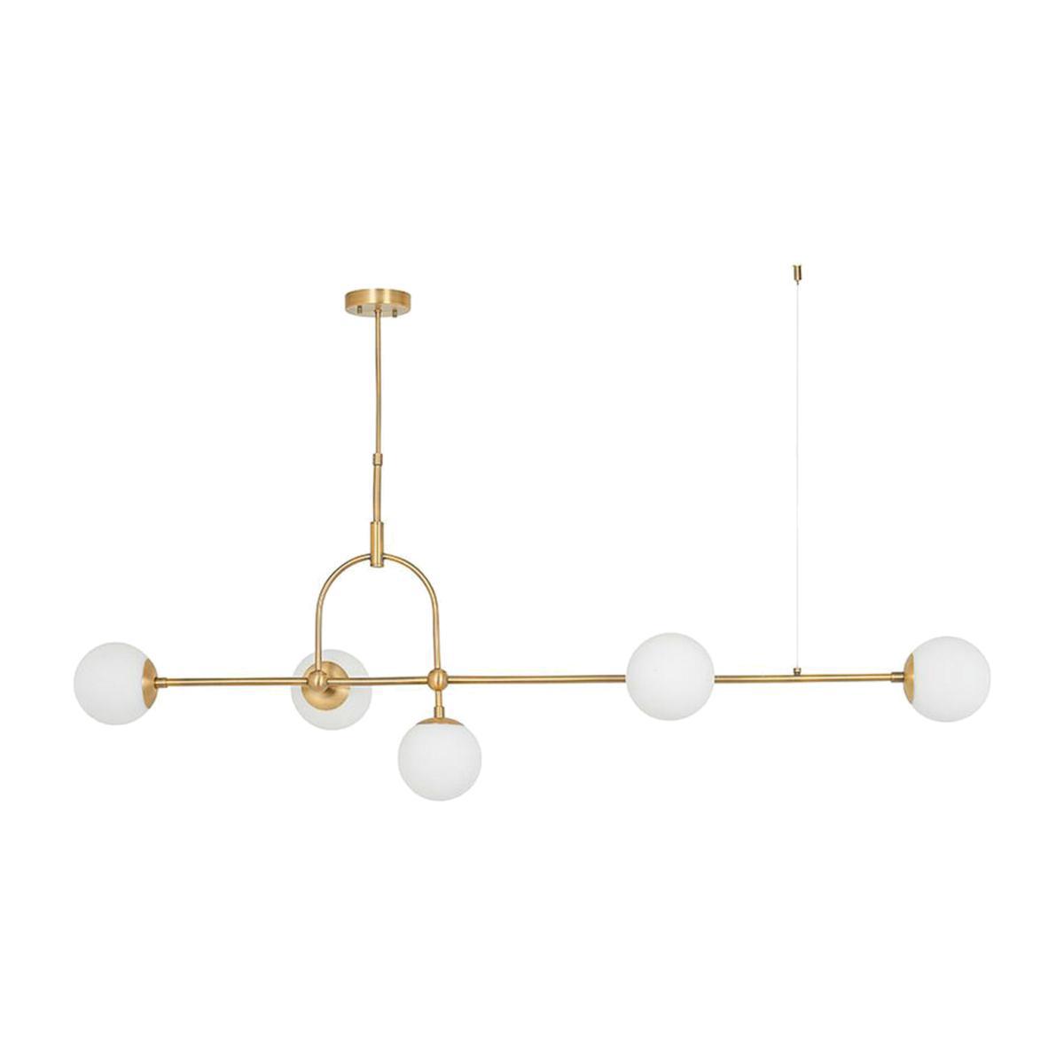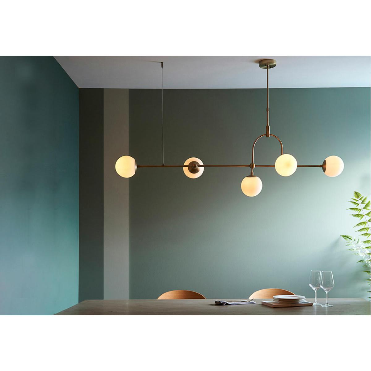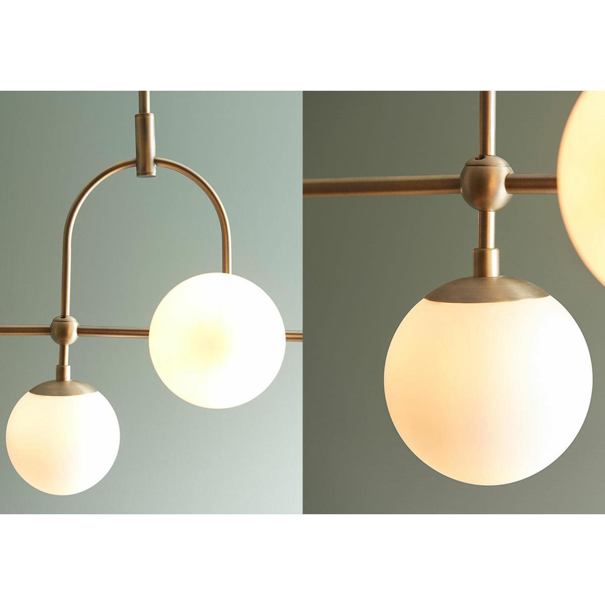 I love this pendant for its clean, contemporary aesthetic with a touch of vintage charm thanks to the antique brass finish. It works particularly well in modern or transitional interiors, adding warmth and character without overwhelming the space. The large opal glass spheres diffuse light softly, making it a great choice for dining areas or living rooms where you want to create an inviting atmosphere. Practical styling tips include pairing it with other brass accents to pull the look together or hanging multiple pendants at varying heights for a more dramatic effect over a kitchen island or dining table. Its versatile design easily elevates both minimalist and eclectic interiors.