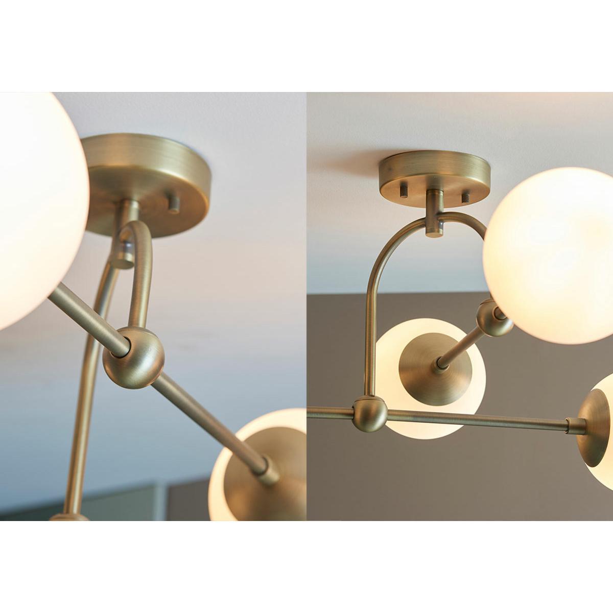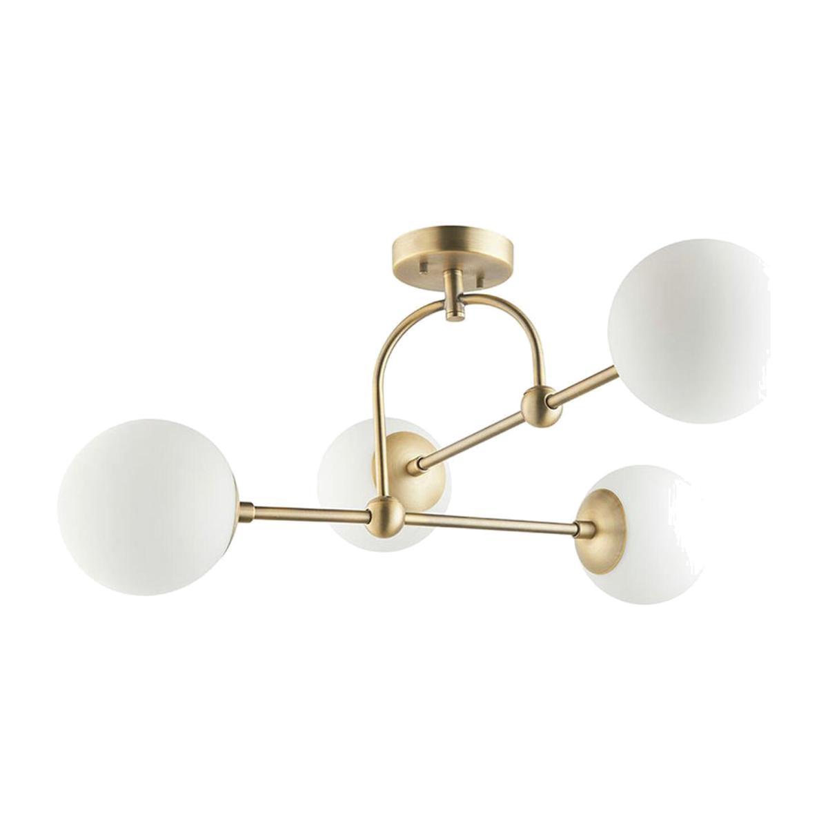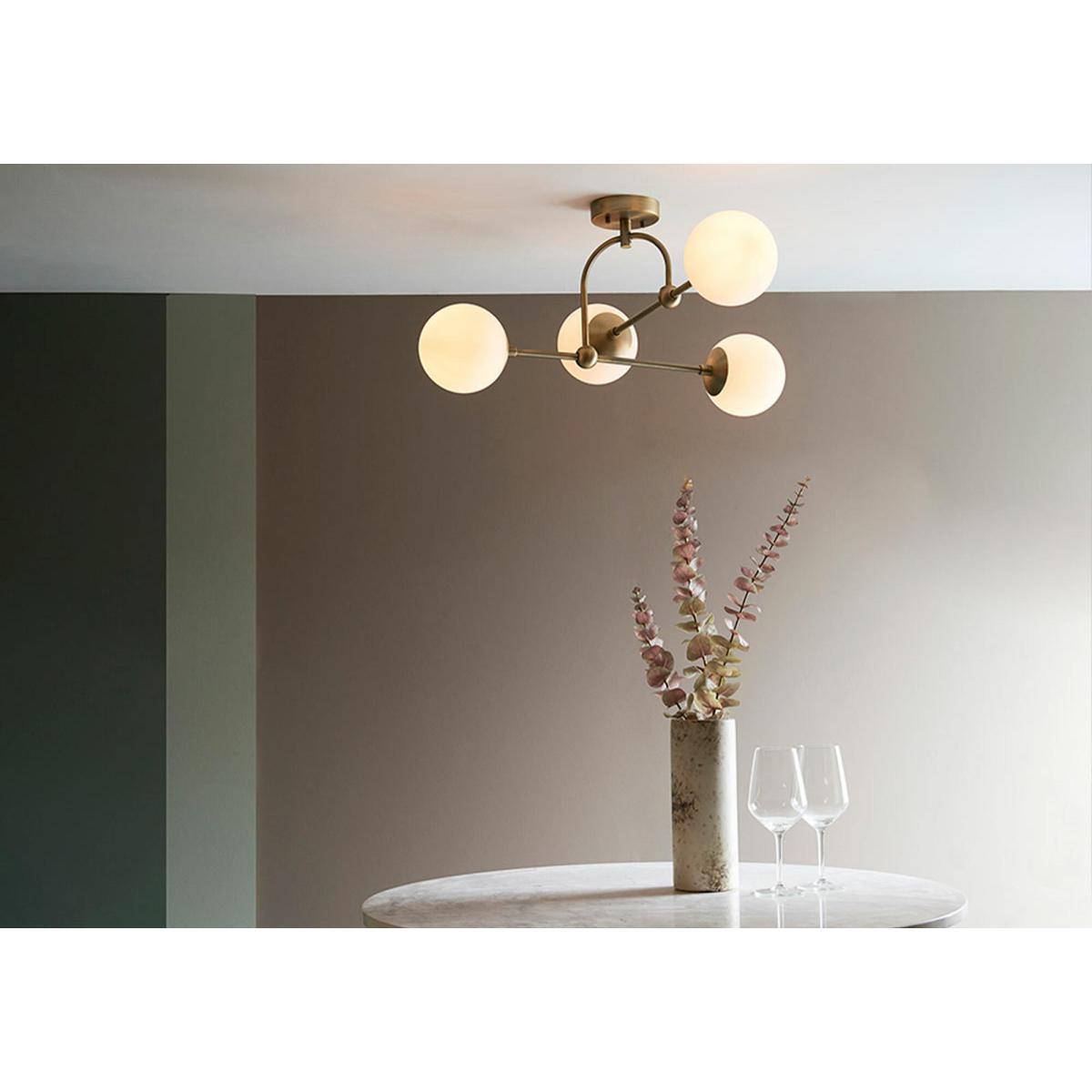Introducing Luna, a modern range with the perfect level of cosy glow. This semi-flush ceiling light, showcasing four perfect moon-like spheres of opal glass, illuminates a warm white ambient light which is beautifully contrasted by antique brass metalwork. Modern and homey, be sure to check out other ceiling pendants in Luna's range as well as the matching wall light if you're looking to transform your space into a welcoming abode.