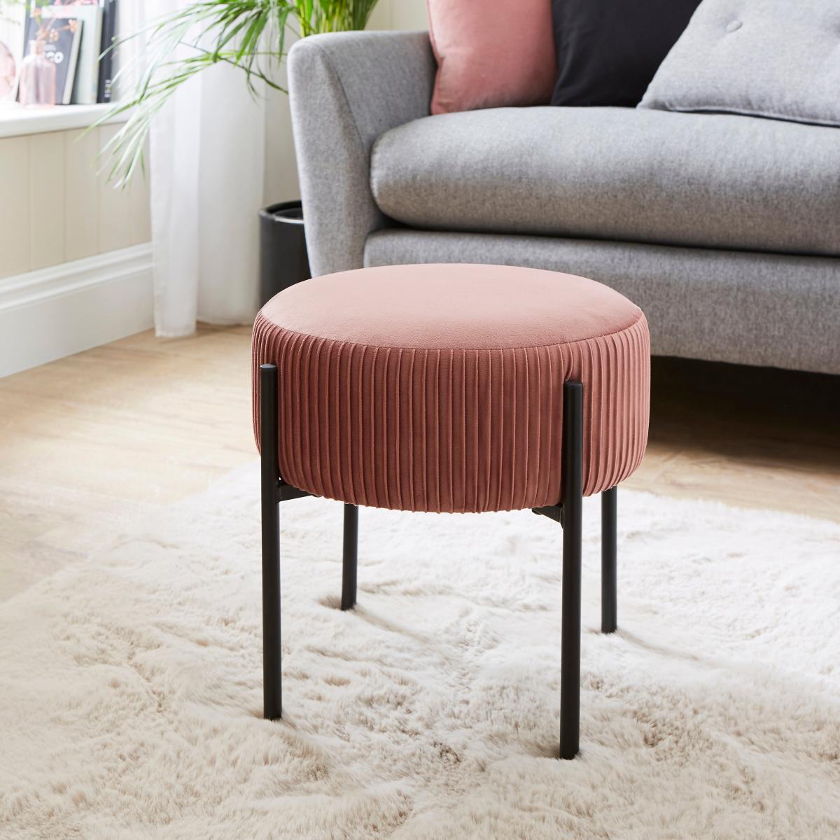 I love this footstool's soft pink velvet finish and pleated design-it adds a subtle touch of luxe without overwhelming a space. It works particularly well in contemporary or minimalist interiors, where its colour can introduce a gentle pop or in Scandi-inspired schemes for a touch of warmth. Practical styling tips include pairing it with a sleek sofa like grey or neutral tones for contrast, or using it as a versatile piece that can double as extra seating or a side table with a tray on top. Its durable velvet and slender legs also make it suitable for smaller living rooms or cosy corners, giving a stylish yet functional boost to your space.
