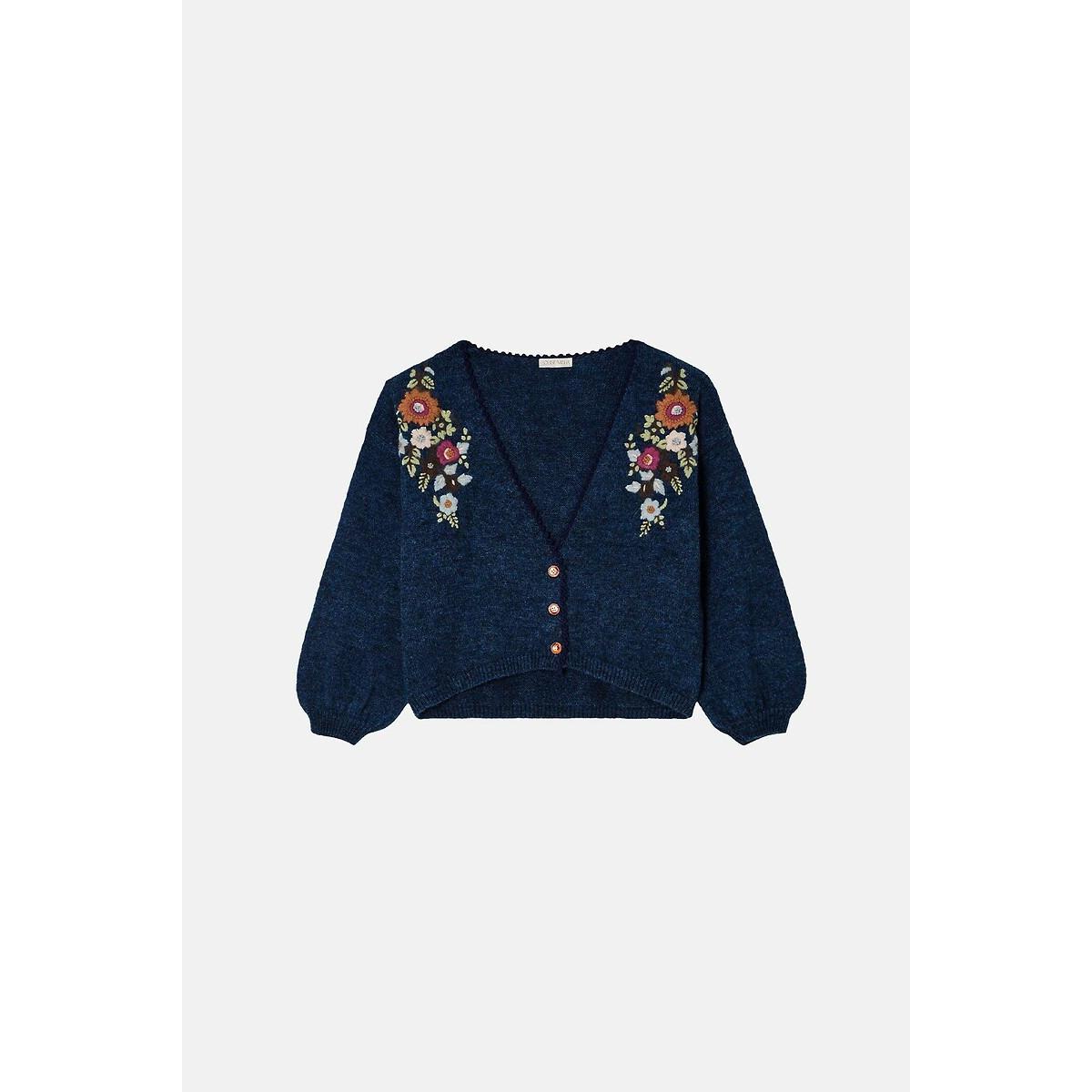Lunami V-Neck Cardigan with Embroidered Flowers
