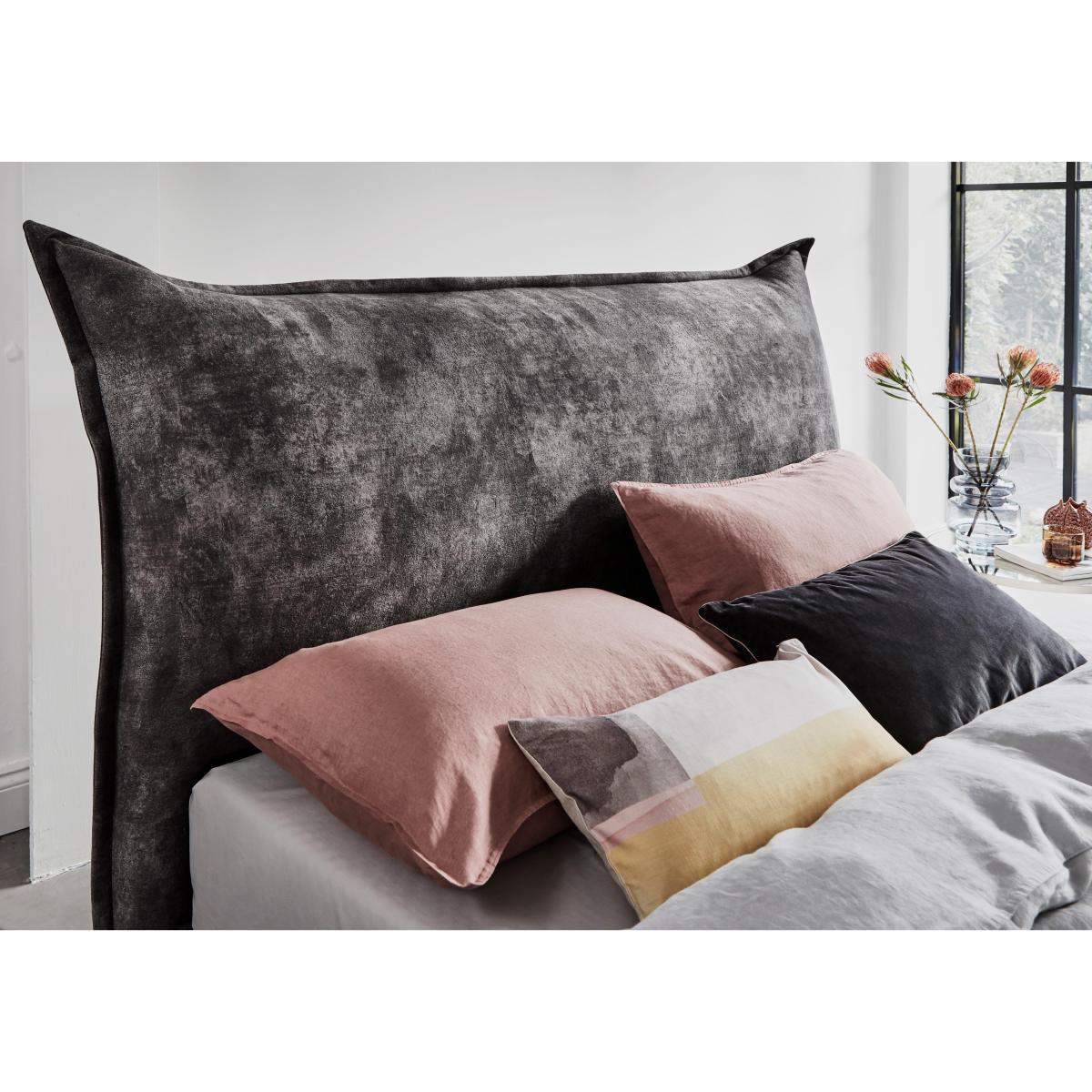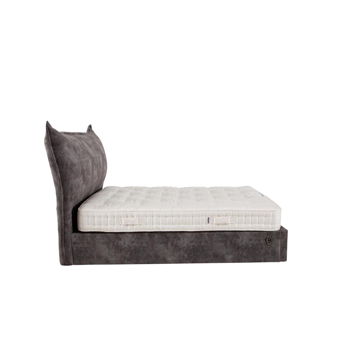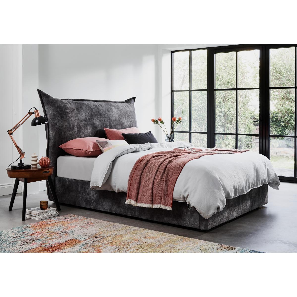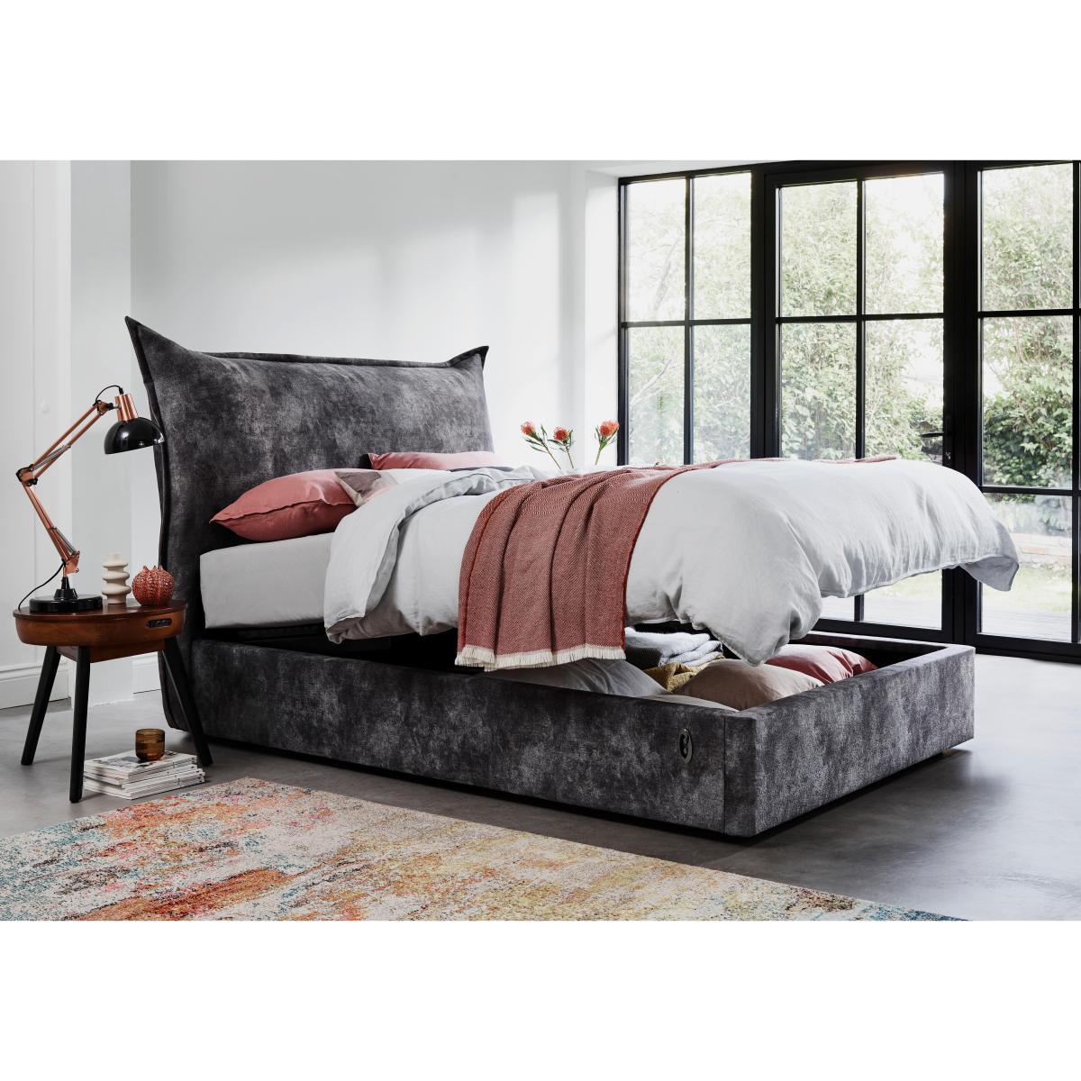 Internal storage dimensions. Double. Height: 20cm, Width: 121cm, Length: 194cm. King. Height: 20cm, Width: 136cm, Length: 194cm. Super King. Height: 20cm, Width: 166cm, Length: 194cm. Luxuriously upholstered in a wide choice of gorgeous fabrics. Sprung, generously cushioned headboard is serpentine sprung. Spacious ottoman storage with easy, power-assisted access. The Lunar electric ottoman bed frame is the perfect combination of luxurious comfort, designer style and easy to access ottoman storage. It has a sumptuously cushioned headboard with an attractive, unusual silhouette. Serpentine sprung and filled with luxury fibre, this headboard is so inviting you’ll look forward to those lie-ins. The bed frame comes in the standard sizes and is upholstered in a choice of gorgeous fabrics and colours. This ottoman is power-assisted, so you can access the ottoman storage at the touch of a button with no lifting required. Beneath you’ll find extra spacious ottoman storage, ideal for seasonal clothes, linens and anything else you only need occasionally. The clever design of this ottoman maximises the space available. Strong and sturdy with springy and resilient slats, the Lunar ottoman bed frame is British made, and exclusive to Furniture Village. Please note: Some fabrics like velvet will show shade variations due to their natural pile. Light vacuuming using a curtain attachment or brushing using a soft brush in the direction of the pile will minimise this effect. Please keep hands clear of the mechanism when opening and closing this ottoman bed frame. Do not operate the ottoman with anyone on the bed. Mattress sold separately.