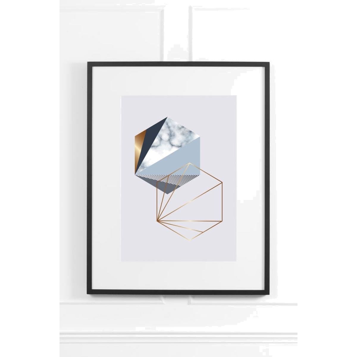 A geometric printed design in tones of grey and blue, hand finished with a gold metallic ink. 250gsm paper with a satin finish complete with an elegant matte black wooden frame.