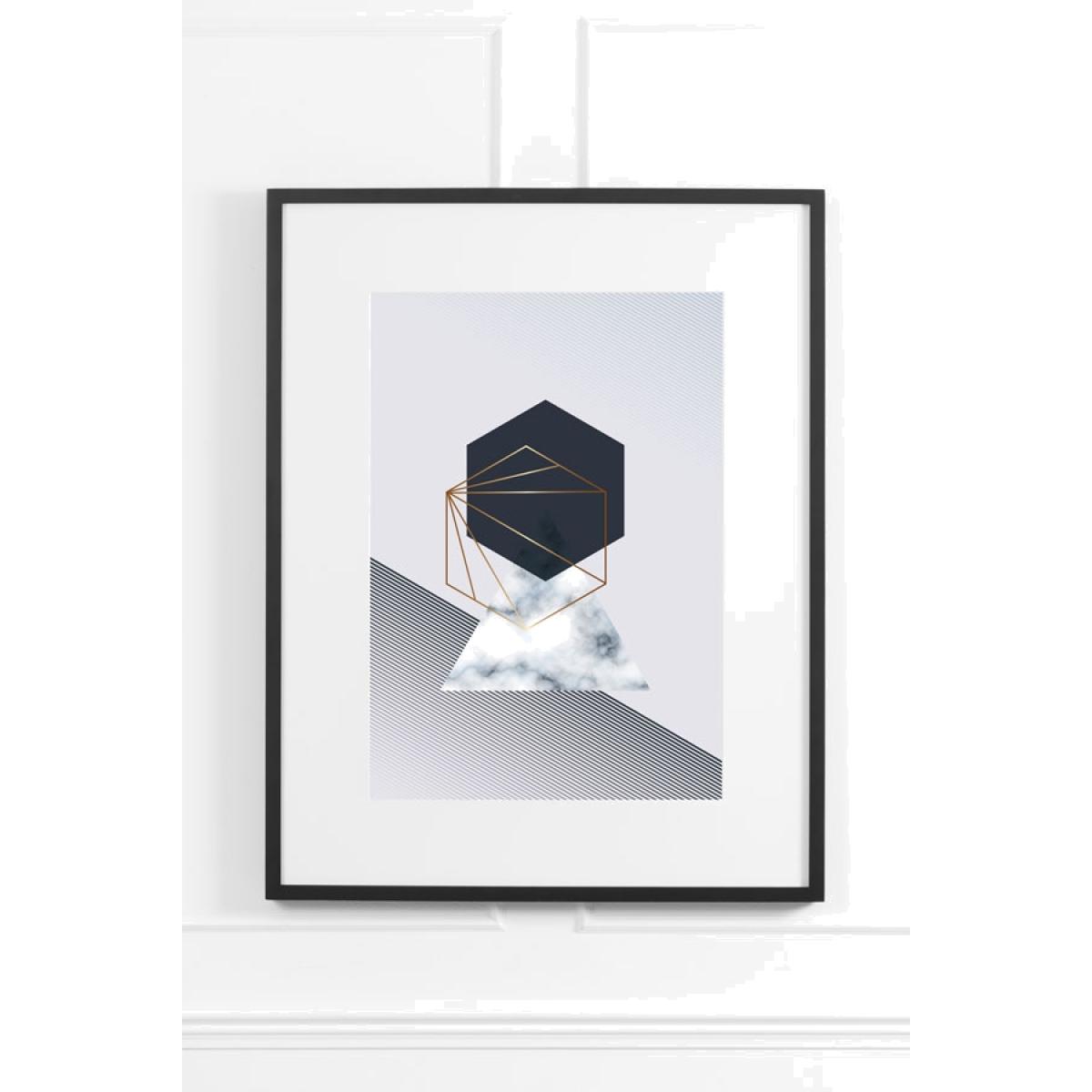 A geometric printed design in tones of grey and blue, hand finished with a gold metallic ink. 250gsm paper with a satin finish complete with an elegant matte black wooden frame.