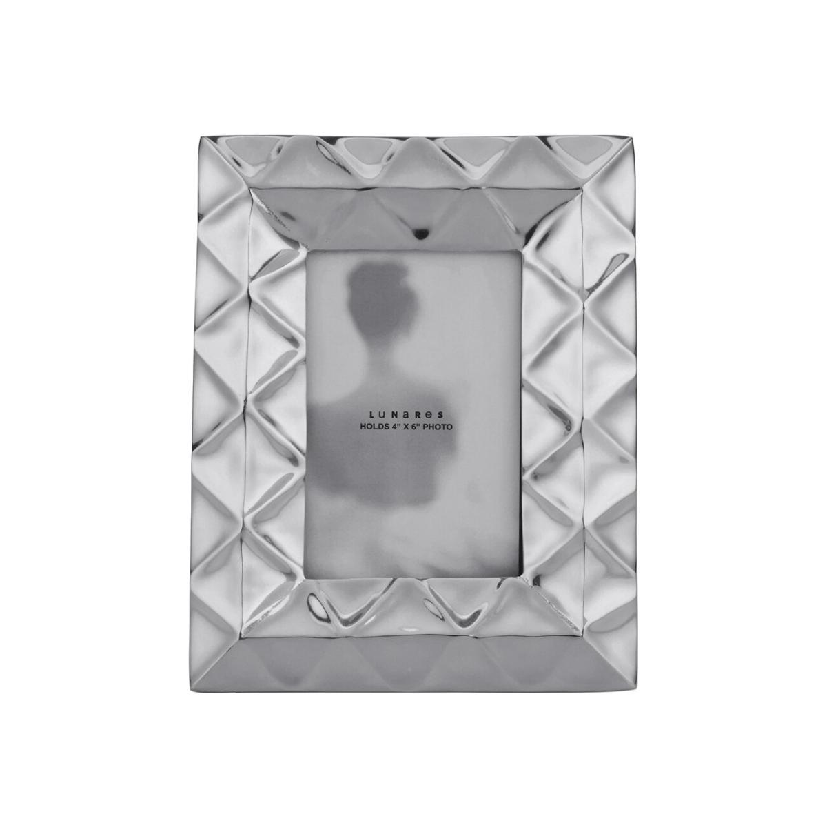 Showcase your most treasured memories with this Geo photo frame from Lunares. Handmade from aluminium, it features a geometric surface and has been finished in a silver colour. Pair with more accessories from Lunares to complete the look. Key features: * Material: aluminium, glass * Dimensions: H23xW19xD4cm * Aperture size: 4x6" * Geometric design * Silver colour * Please note, due to the handmade nature each piece is unique