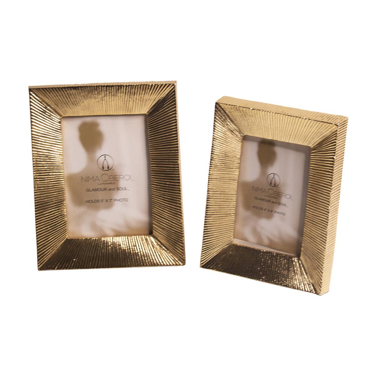 Showcase your most beloved memories in this Miyake photo frame from Lunares. Handcrafted from aluminium, it features carved stripes and has been finished in a golden tone. Pair with more accessories from Lunares to complete the look.