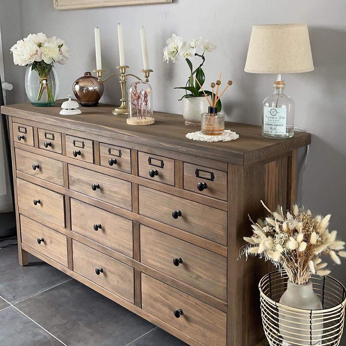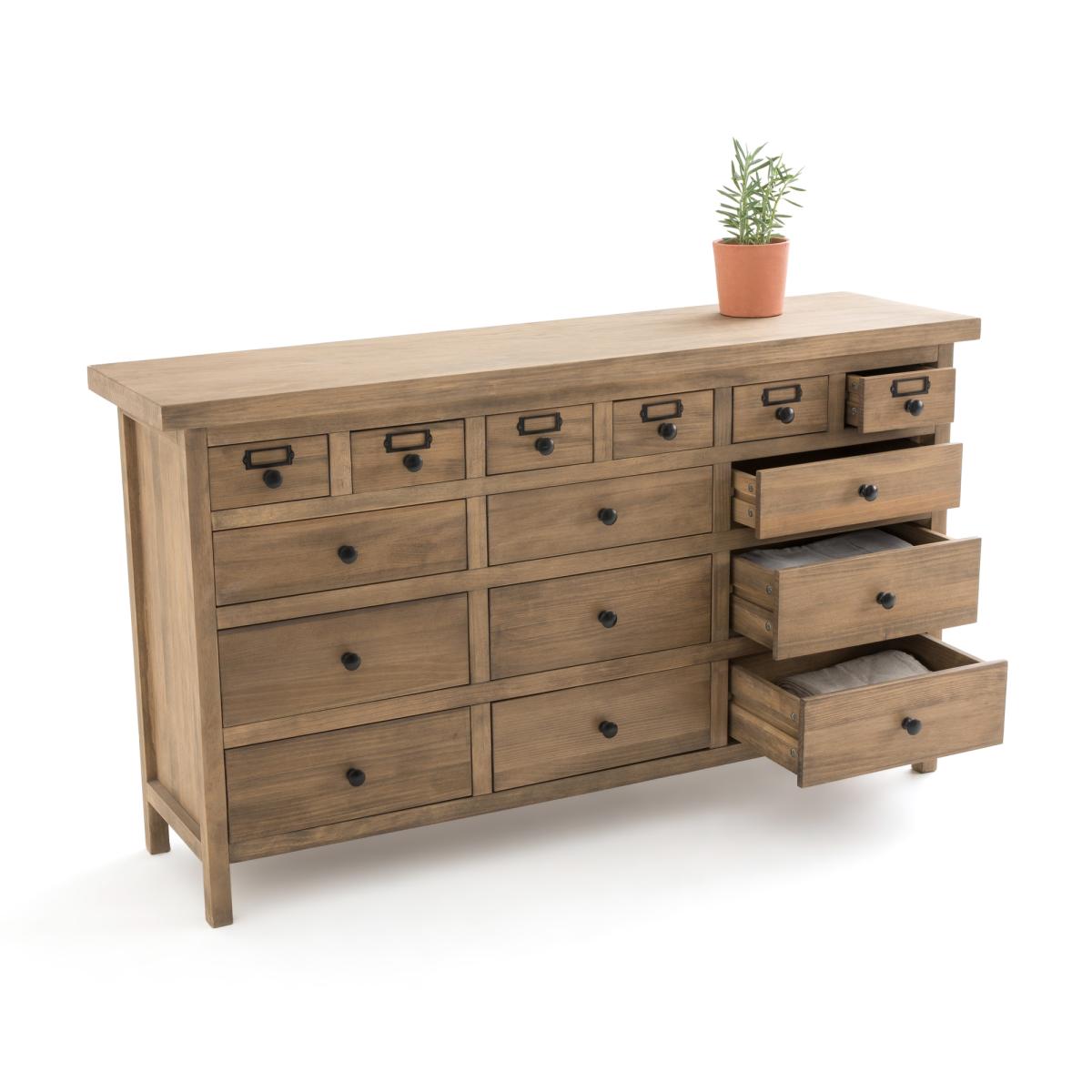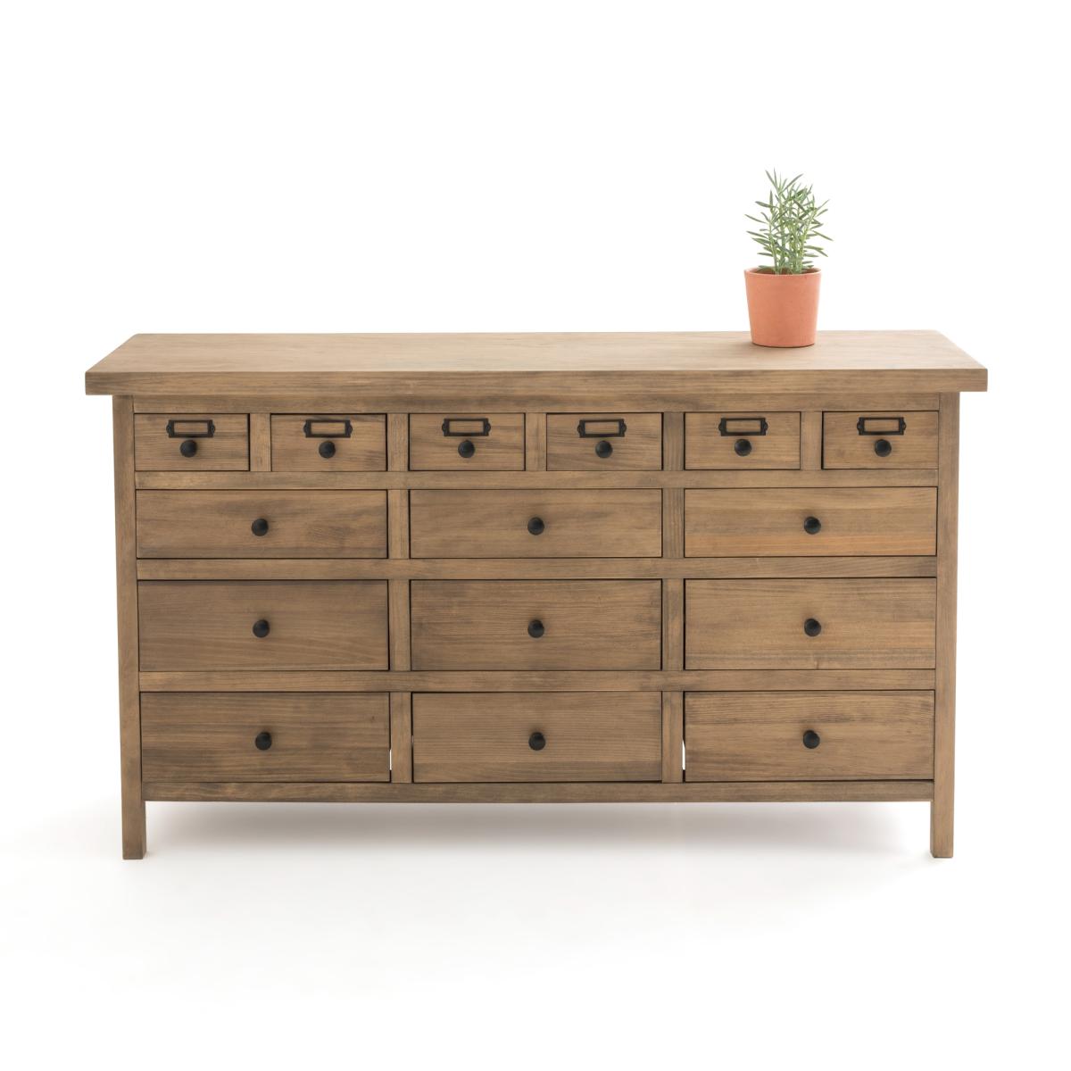 Find a place for everything with this generous cabinet from our Lunja range. Inspired by antique furniture, this solid, 15-drawer unit will be hugely practical in the living room. Robust and roomy, it's ideal for storing table linen, dishes and more. Product details: • 15 drawers • 9 Knobs • 6 label holders • Neat finish • Sold pre-assembled. • Solid pine with delicate teak-like hues, waxed finish • Aged metal knobs. Dimensions:Overall: • Width: 150cm • Height: 85cm • Depth: 40cm. Useable space: • Small drawers:L14.5 x H7 x D28 cm • Large drawers: L38 x H7 x D28 cm. Shop the whole Lunja collection online. Dimensions and weight of package:1 boxL15. 6 x H91 x D49 cm42.3 kg. Home delivery:Your Lunja cabinet is supplied pre-assembled. It will be delivered directly to your door!Note! Please check that all access points are large enough to accommodate your delivery (doors, stairs, lifts).