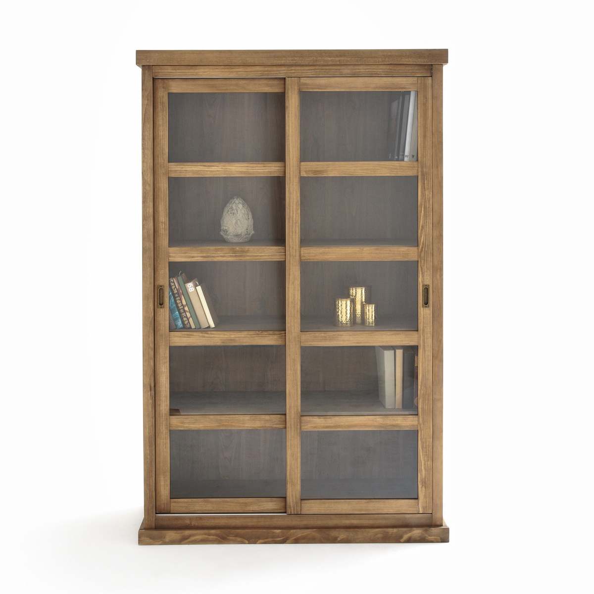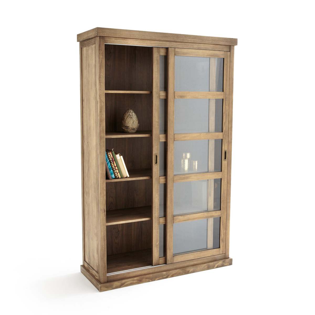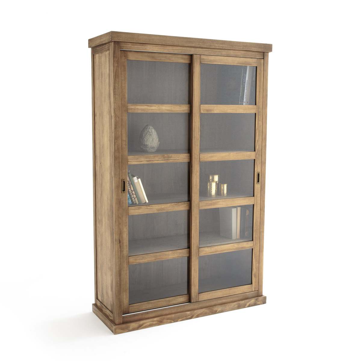 The Lunja sliding door display cabinet in solid pine. Sleek and perfectly proportioned, teak-style finish, it is the essential piece of furniture for storing and displaying books, trinkets, collections.