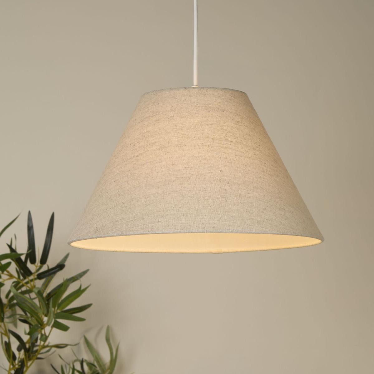 This conical lampshade features a soft, light beige or off-white fabric that adds a gentle, textured touch to its minimalist design. Its shape allows light to diffuse warmly around the bottom edge, creating a cozy and inviting ambiance. The simplicity of the shade makes it a versatile choice for both modern and traditional interiors.