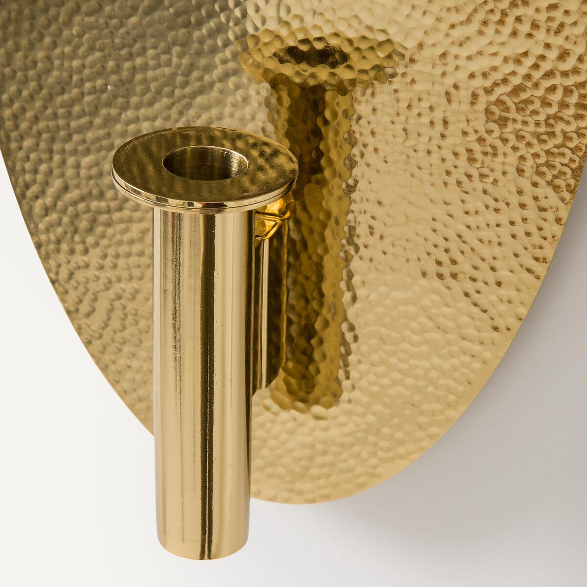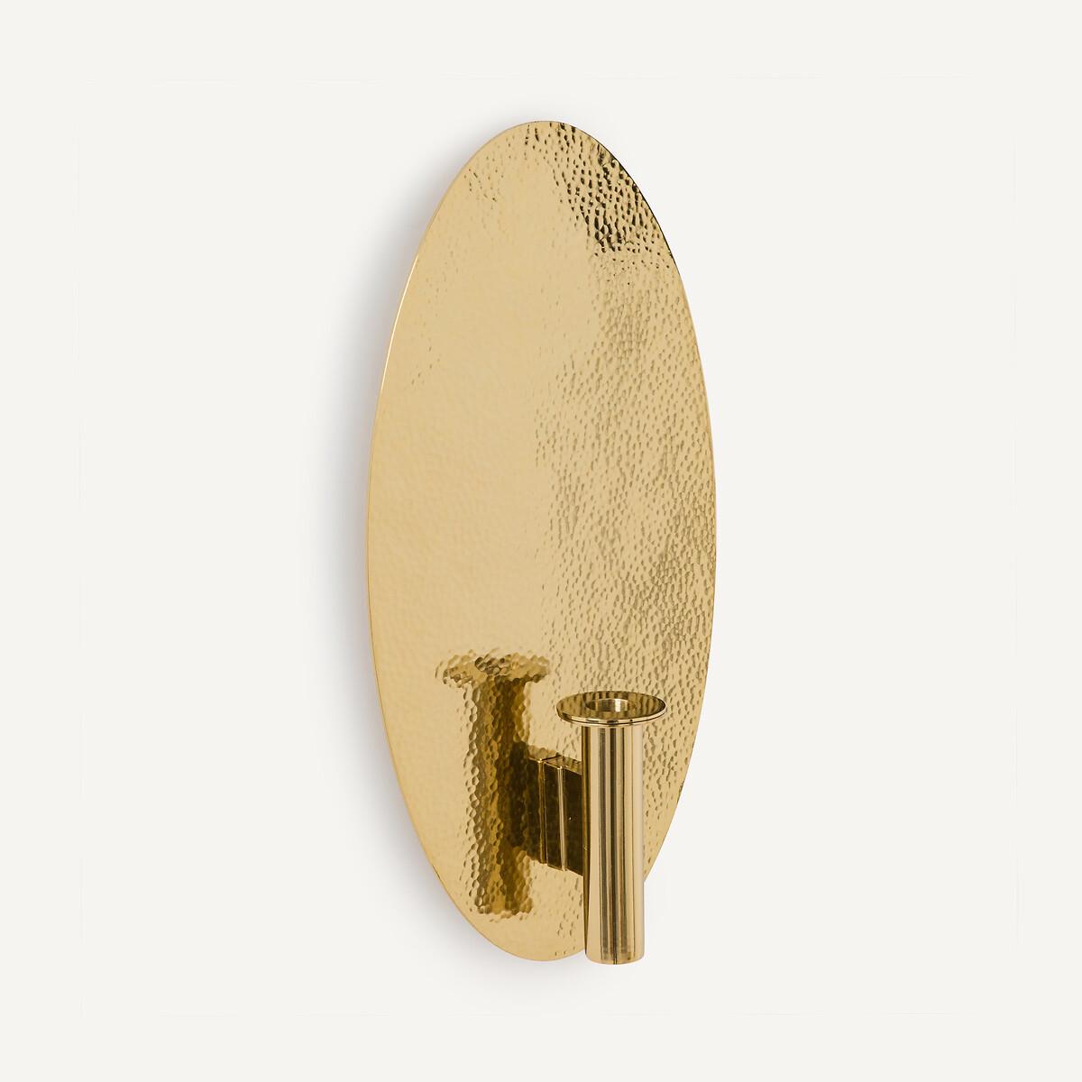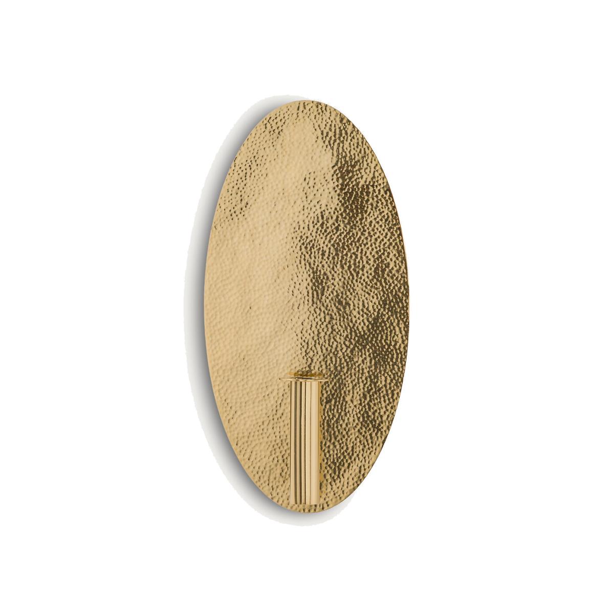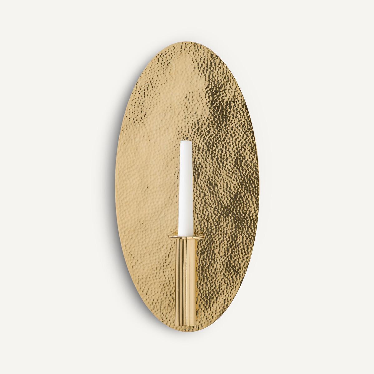 A combo of shapes and textures for this stylish sconce with candle holder/bud vase. Lunou combines a round or oval wall-mounted surround in hammered metal with a candle holder/vase in smooth brass. A minimalist, sculptural composition. A sophisticated and timeless decorative object in its own right. Product Details • Hammered stainless steel and smooth metal with a brass coloured finish • Wall hook fixing • Bud vase or candle holder Ø2cm Dimensions • Width: 20cm • Height: 40cm • Depth: 9cm/3.5"Dimensions and weight of parcel1 parcel • L44 x H10 x P23 cm, 2,1 kg