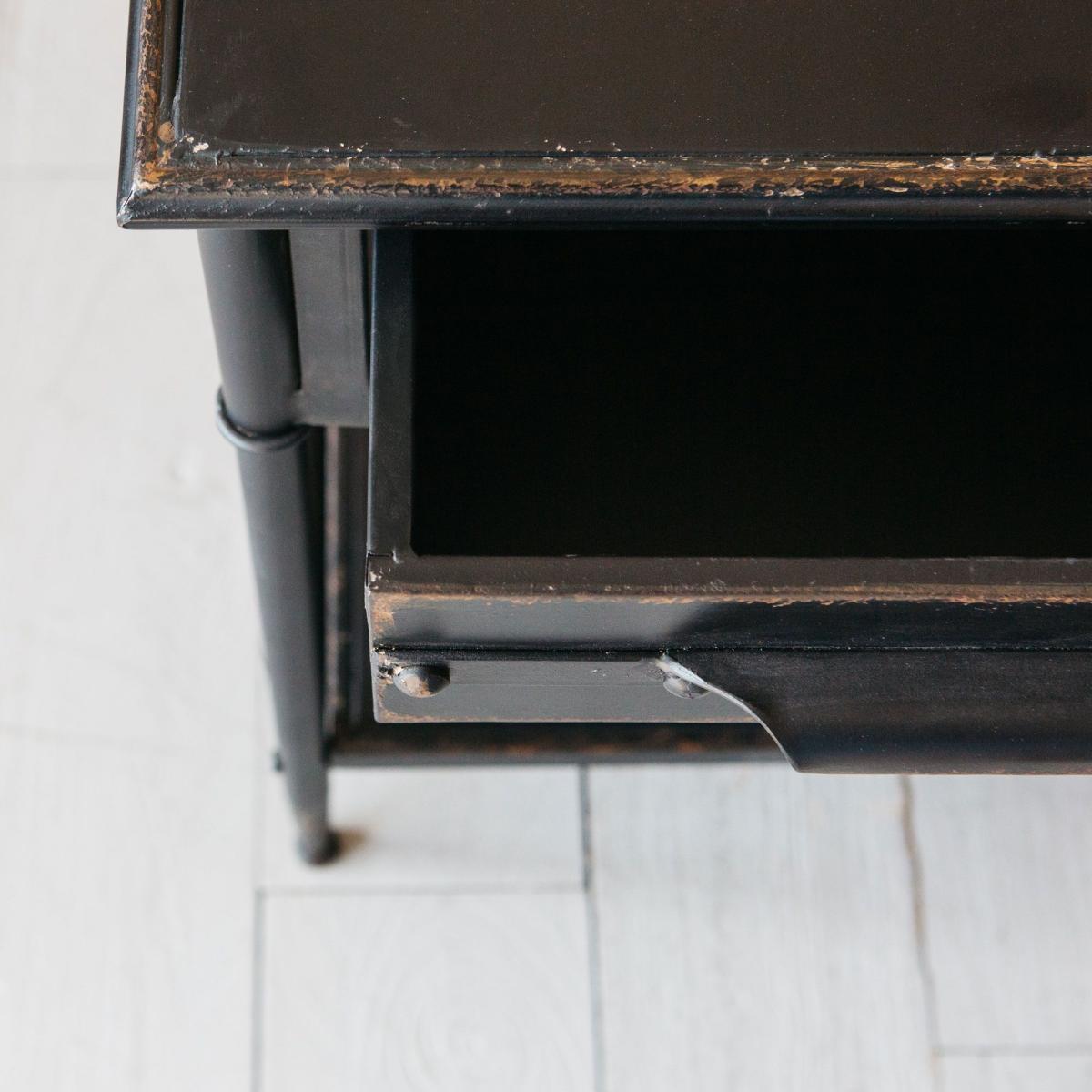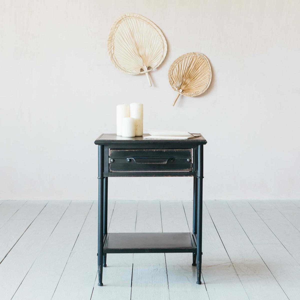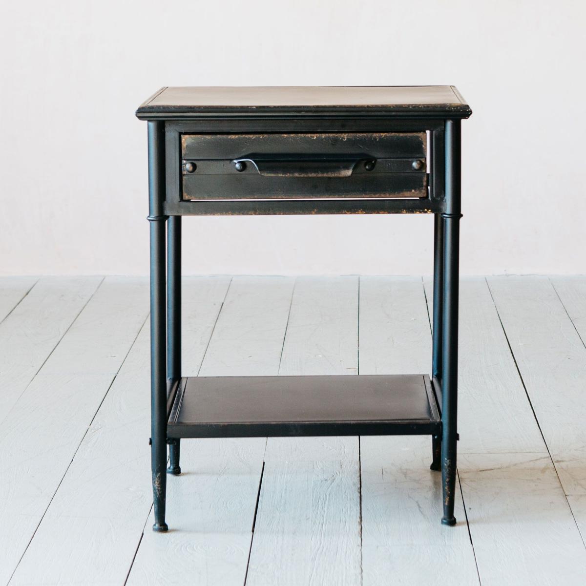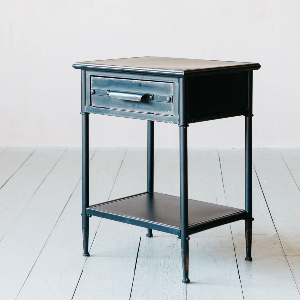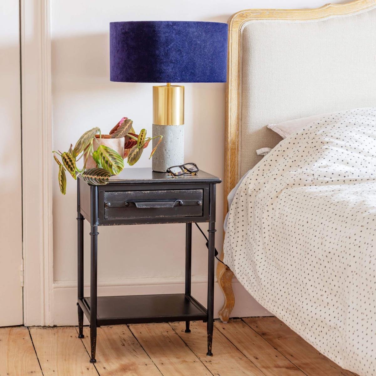 A contemporary metal bedside table with an industrial black finish. Complete with an open shelf and single drawer perfect for storing your bedside pieces.