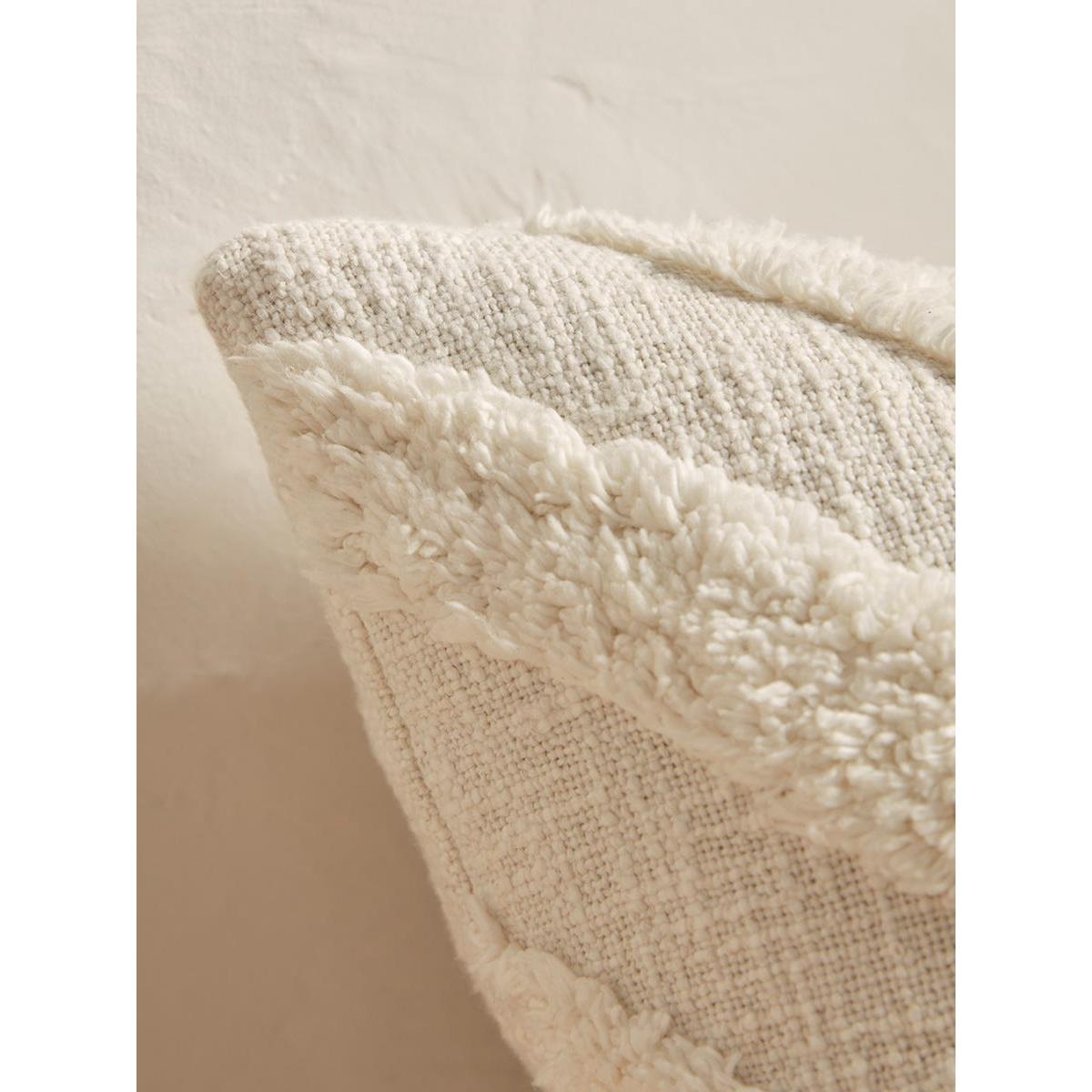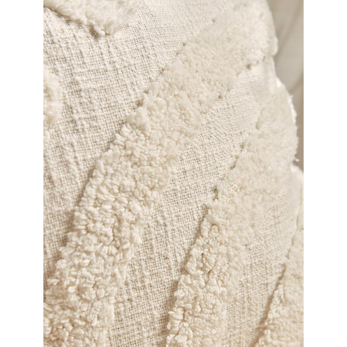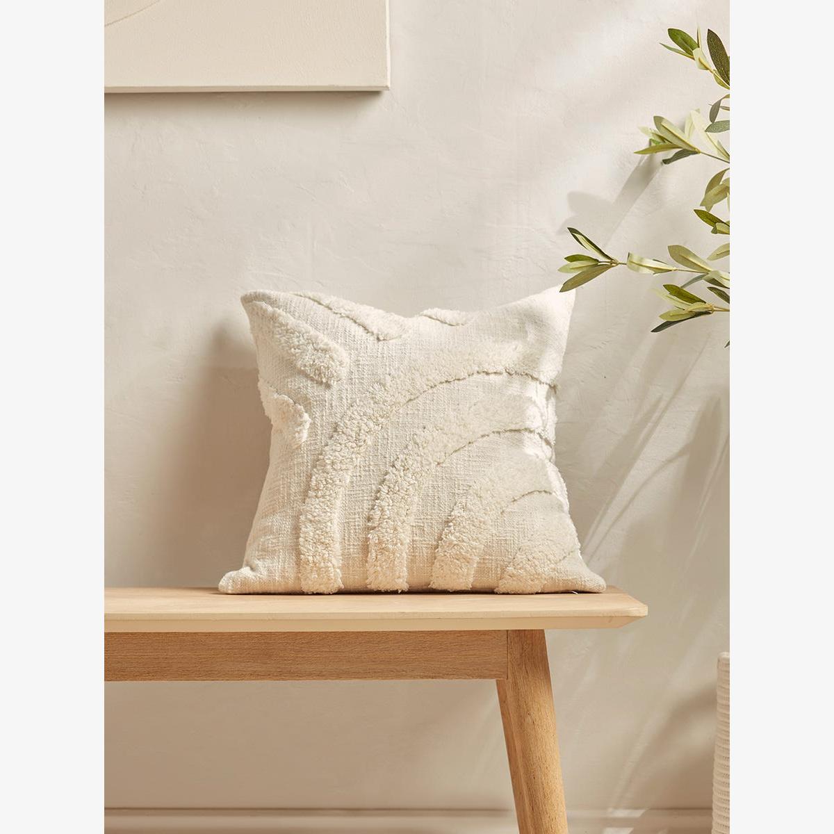 Lovely textural curves and stripes of tufted cotton decorate the slubby woven cover of this cream cushion. Luxuriously soft to the touch, this cushion is great for layering a sofa or bed in a neutral themed room, or for adding a refreshing contrast in a more vibrant colour scheme.