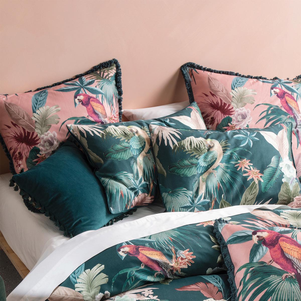 A lavish, romantic take on the colonial style. This vintage wallpaper style design printed on luxurious cotton sateen comes to life with exotic birds and foliage in a luscious palette of teal, faded rose and leafy green hues. Paired beautifully with rose-tinted accessories and is finished with cord piping.