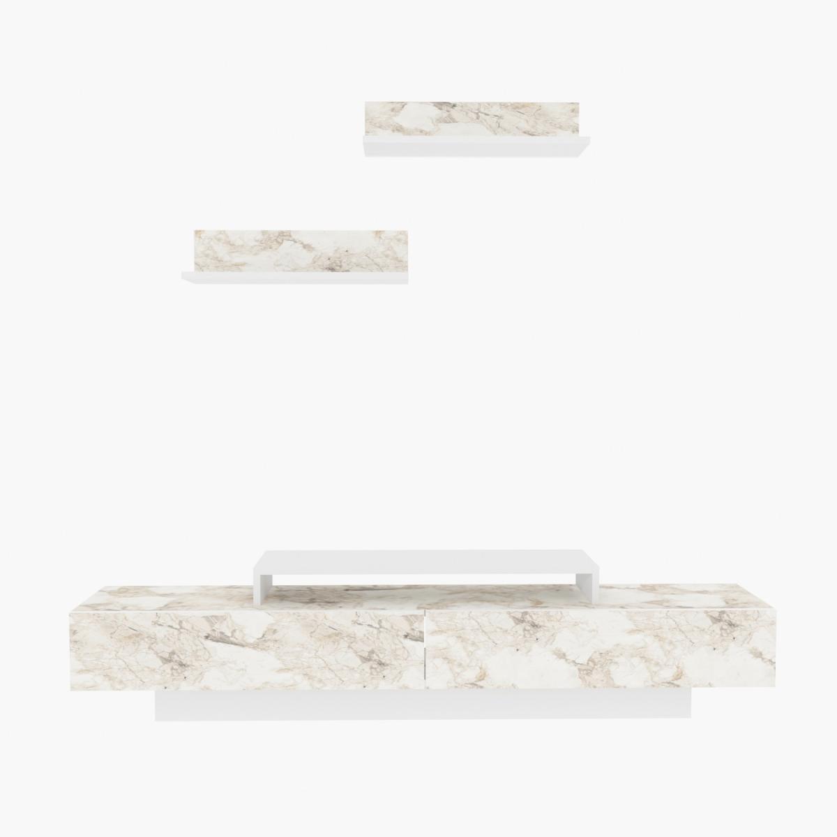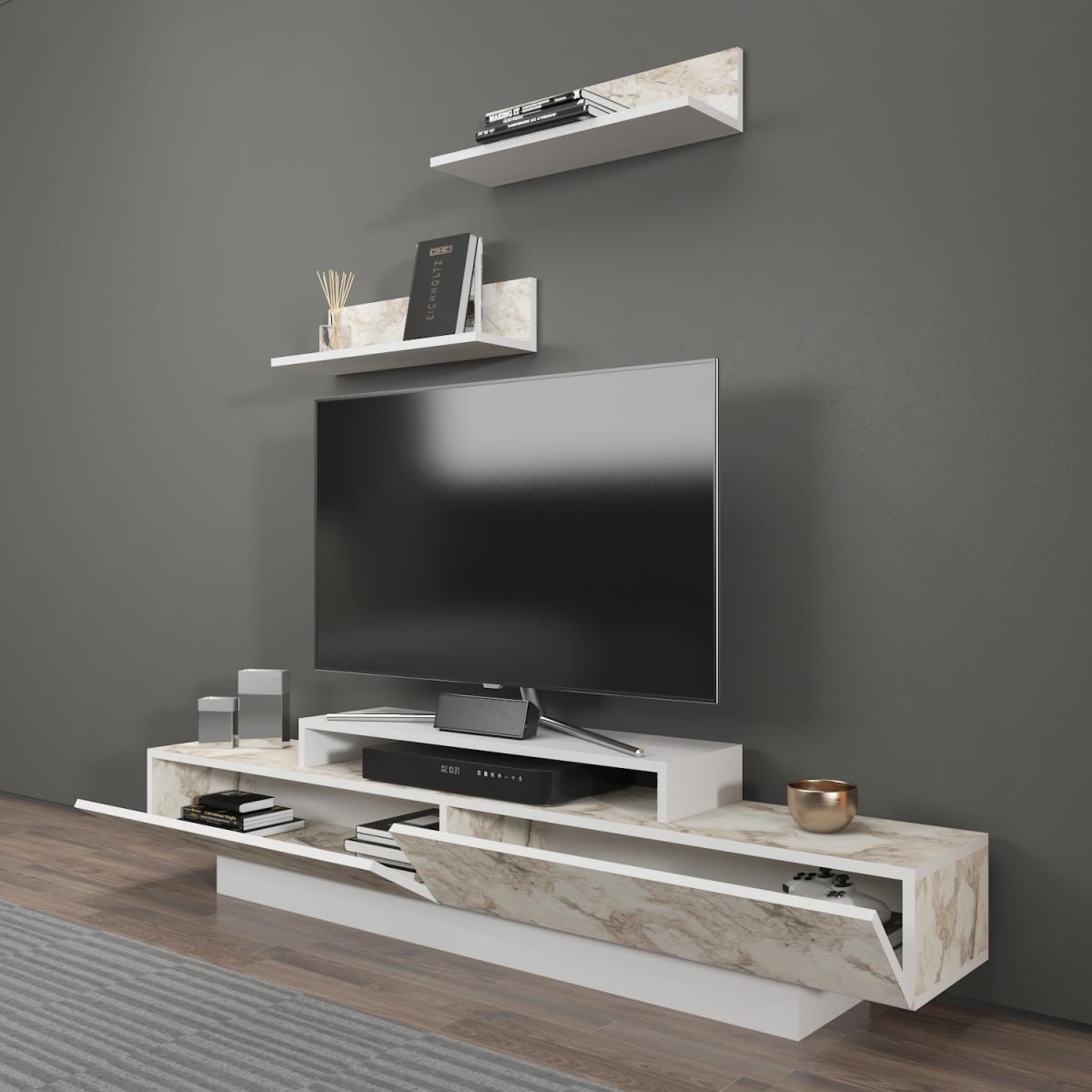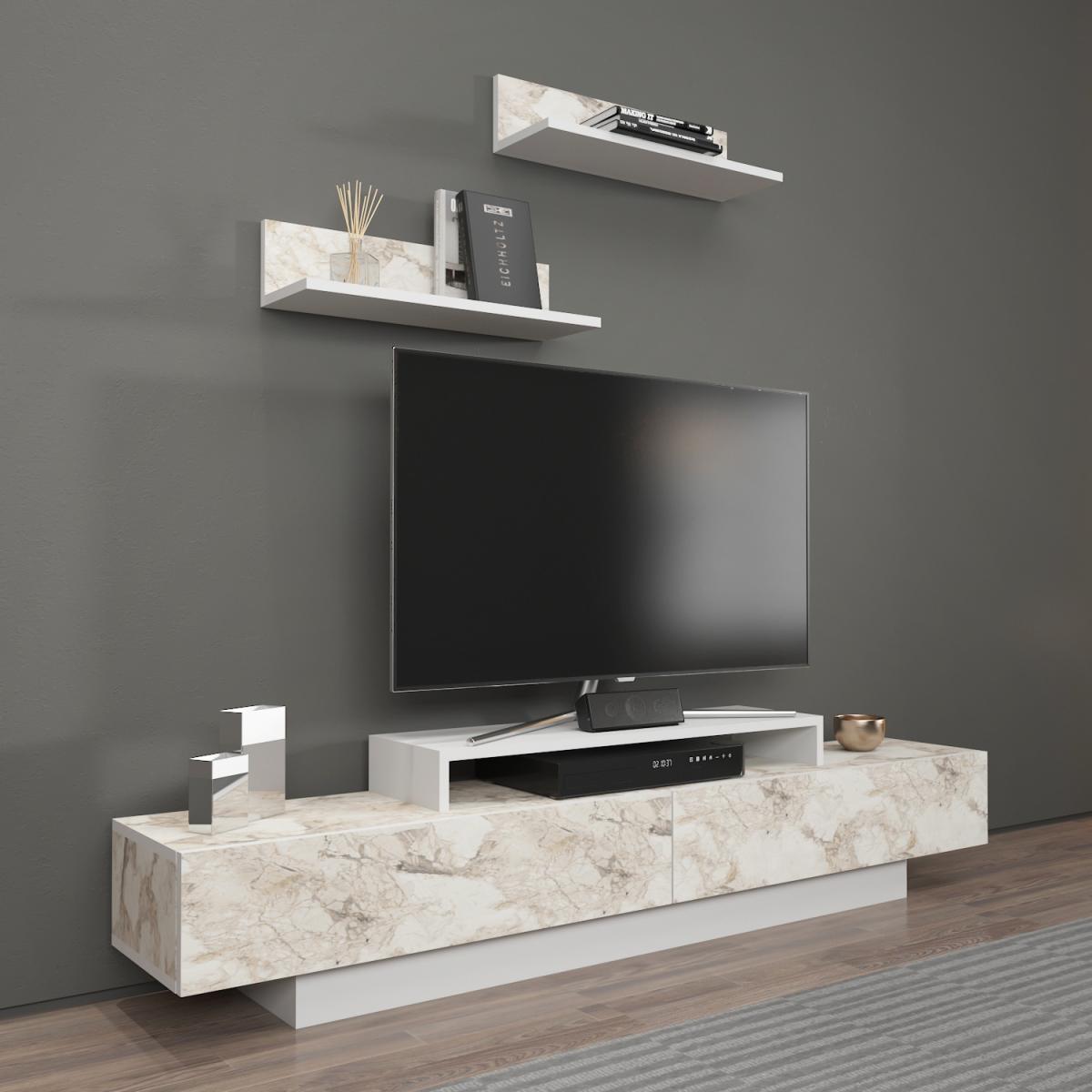 Lusi 180cm wide TV stand and media console for TVs up to 80" will shine in your room while storing your entertainment sets. A special design wall shelf would enhance the contemporary visual in your room and add a unique structure. NOTE - atop the standalone shelf of this unit that the TV sits on does not actually secure to the TV stand. It is freestanding which may be a concern for those with children as it easily pulls off the unit. Please also check the dimensions (width & depth) of your TV legs and atop standalone shelf comparatively and make sure that the TV legs perfectly sit on the atop standalone. The media stand is made of 18mm thick quality melamine coated particle board and banded with first-class PVC edge banding tape. It is manufactured using eco-friendly and health-friendly TSE-certified materials.