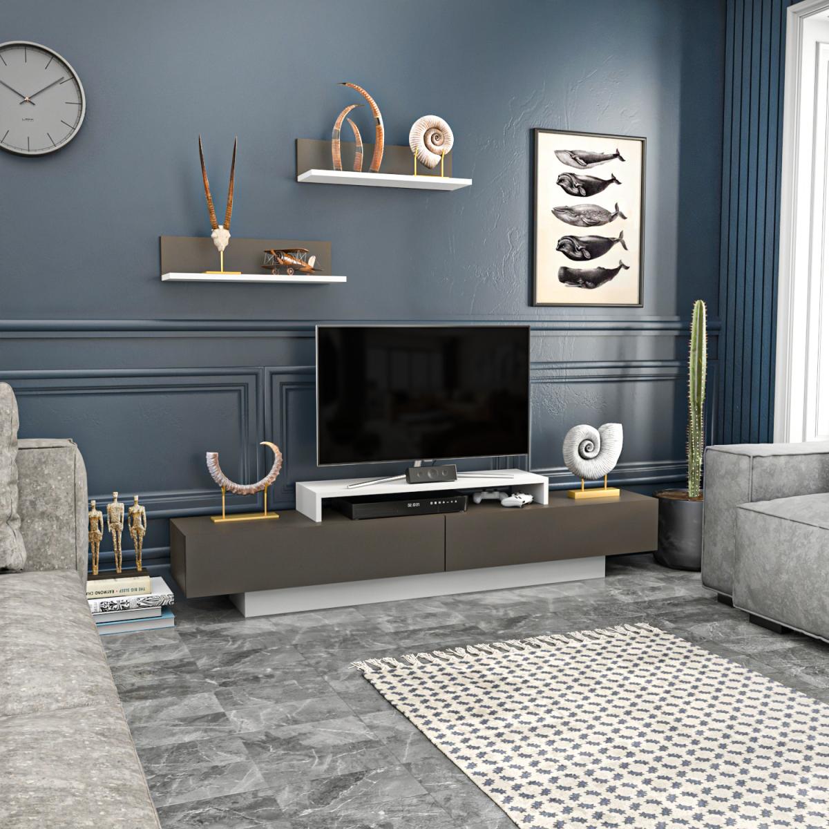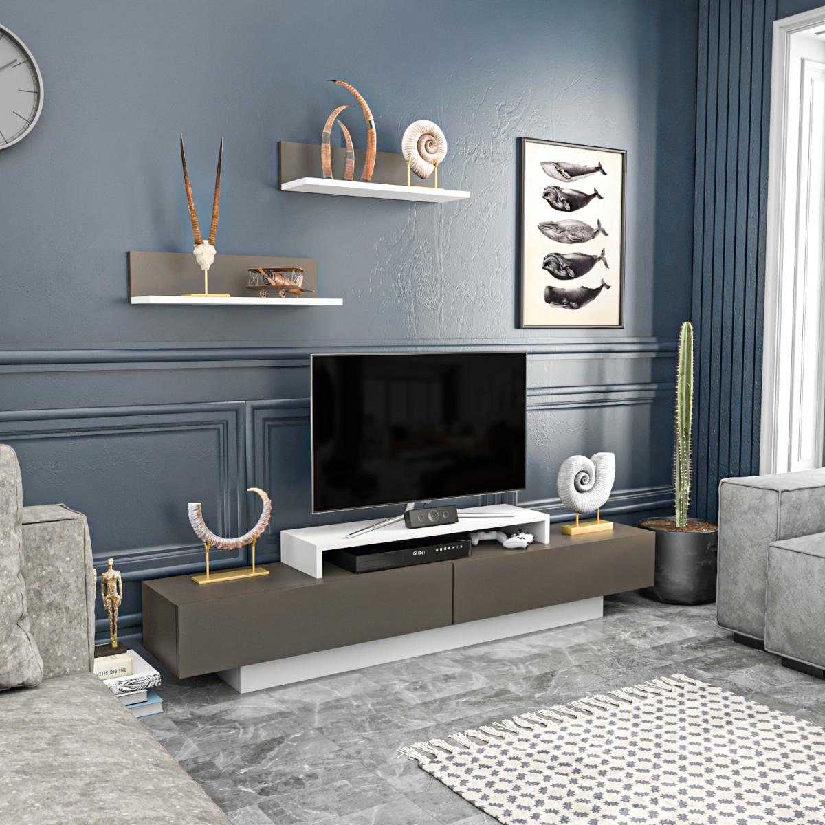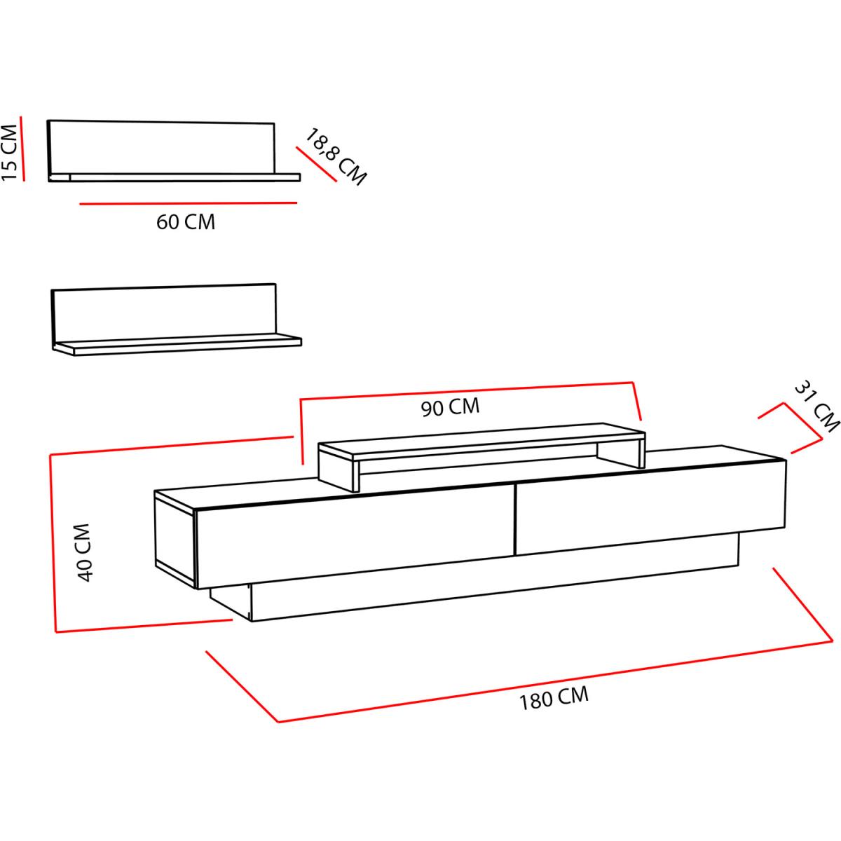 Lusi 180cm wide TV stand and media console for TVs up to 80" will shine in your room while storing your entertainment sets. A special design wall shelf would enhance the contemporary visual in your room and add a unique structure. NOTE - atop the standalone shelf of this unit that the TV sits on does not actually secure to the TV stand. It is freestanding which may be a concern for those with children as it easily pulls off the unit. Please also check the dimensions (width & depth) of your TV legs and atop standalone shelf comparatively and make sure that the TV legs perfectly sit on the atop standalone. The media stand is made of 18mm thick quality melamine coated particle board and banded with first-class PVC edge banding tape. It is manufactured using eco-friendly and health-friendly TSE-certified materials.