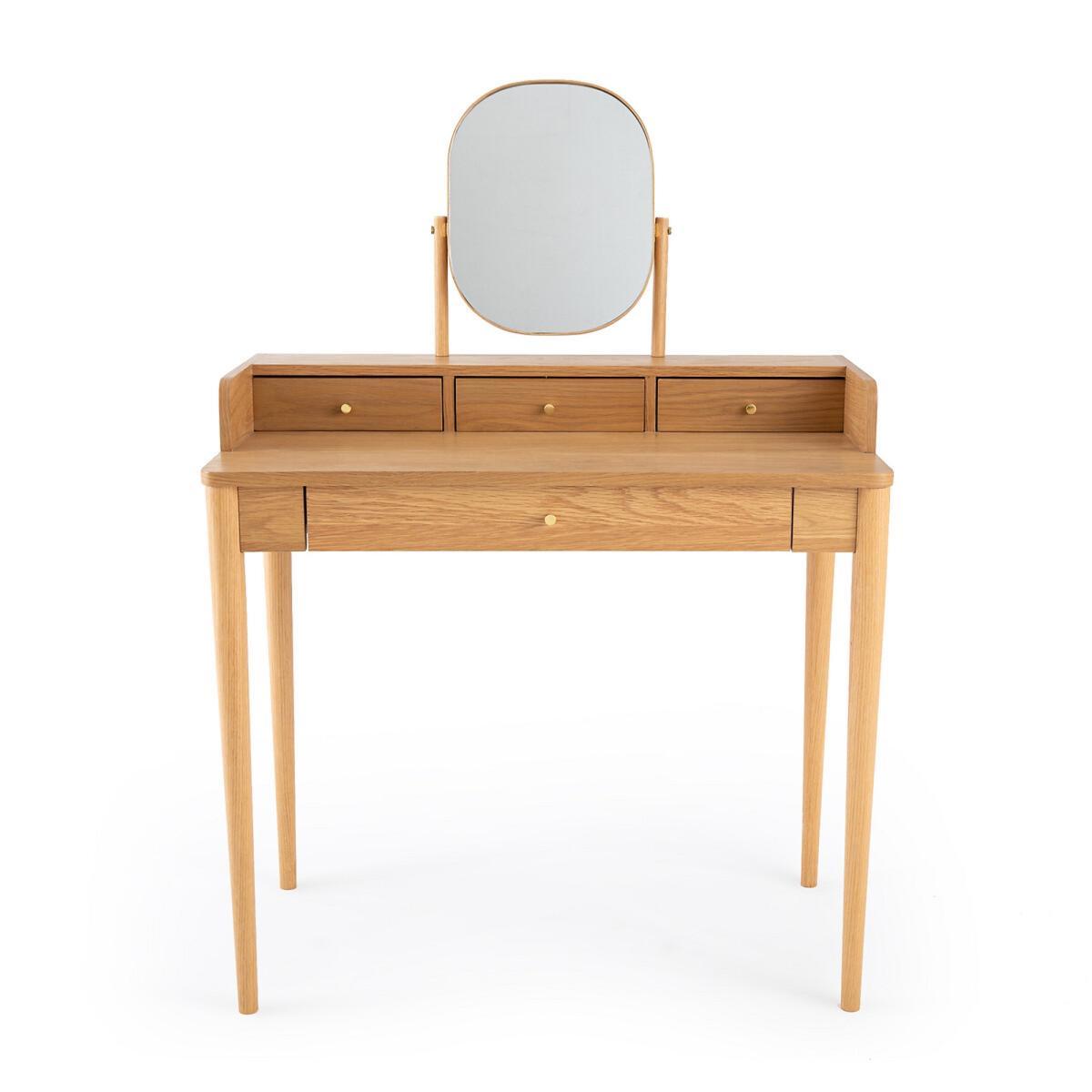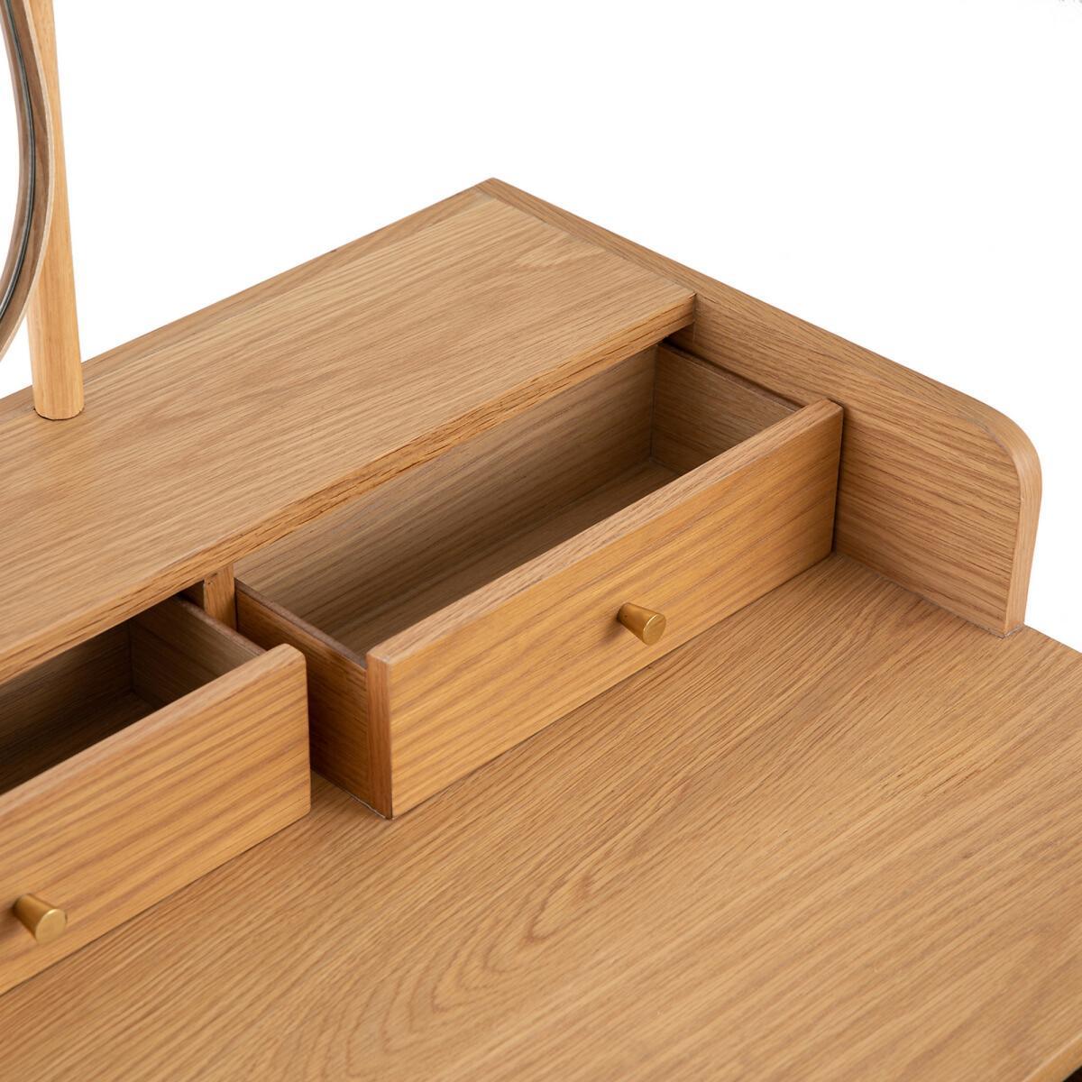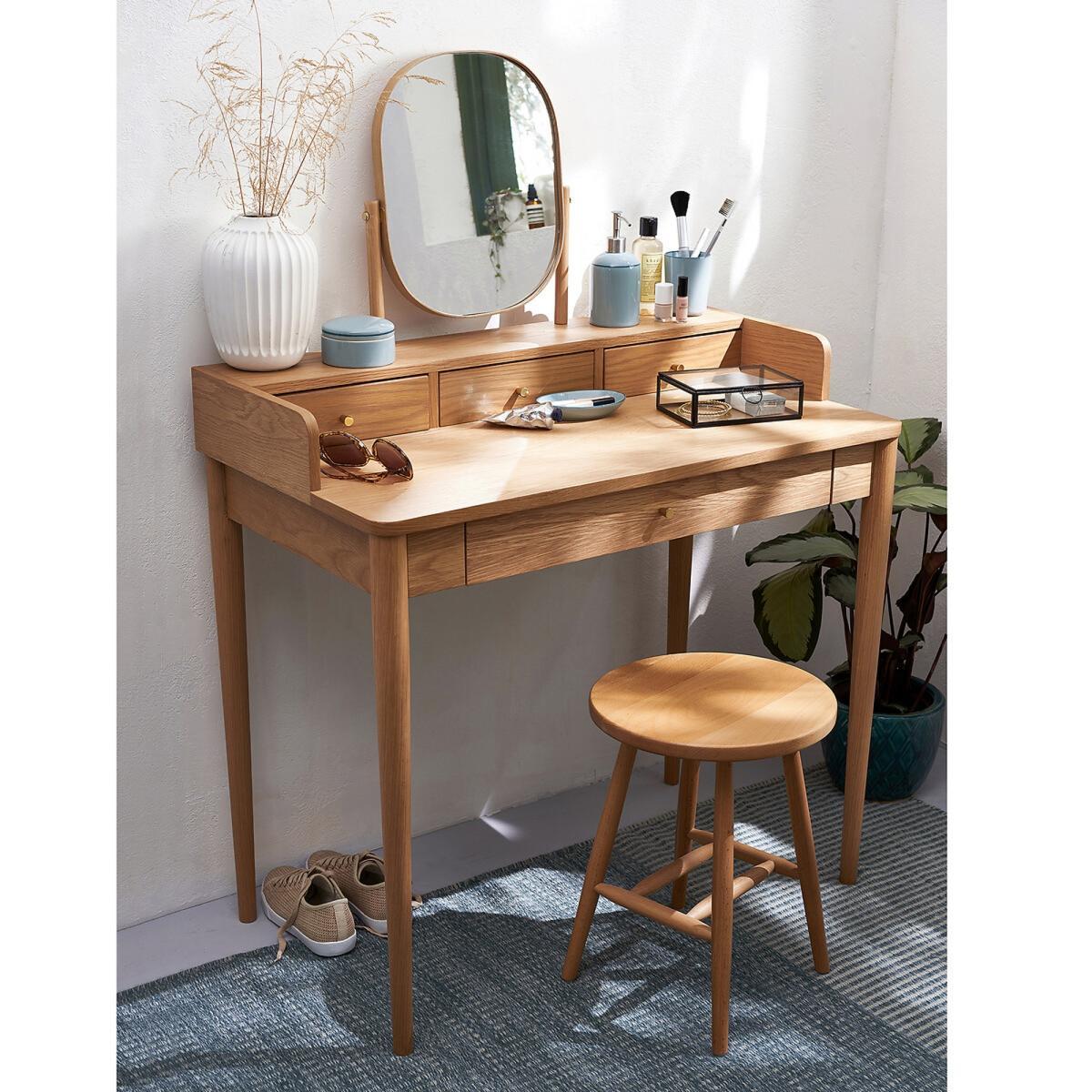 I really like this dressing table for its clean lines and functional design, especially with the extension feature that adds practicality without compromising style. It works well in a variety of interiors, from Scandi-inspired minimalism to cosy vintage-inspired spaces, thanks to its natural wood finish. To style it effectively, keep the surface clutter-free and add a few well-chosen accessories like a small tray for jewellery or a minimal lamp to keep it practical yet polished. The mirror's rounded shape brings a soft touch, making it suitable for bedrooms or dressing areas where simplicity and function are key.