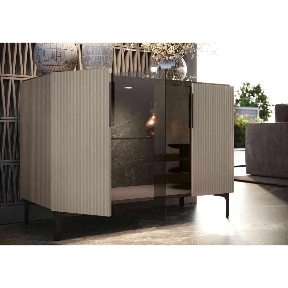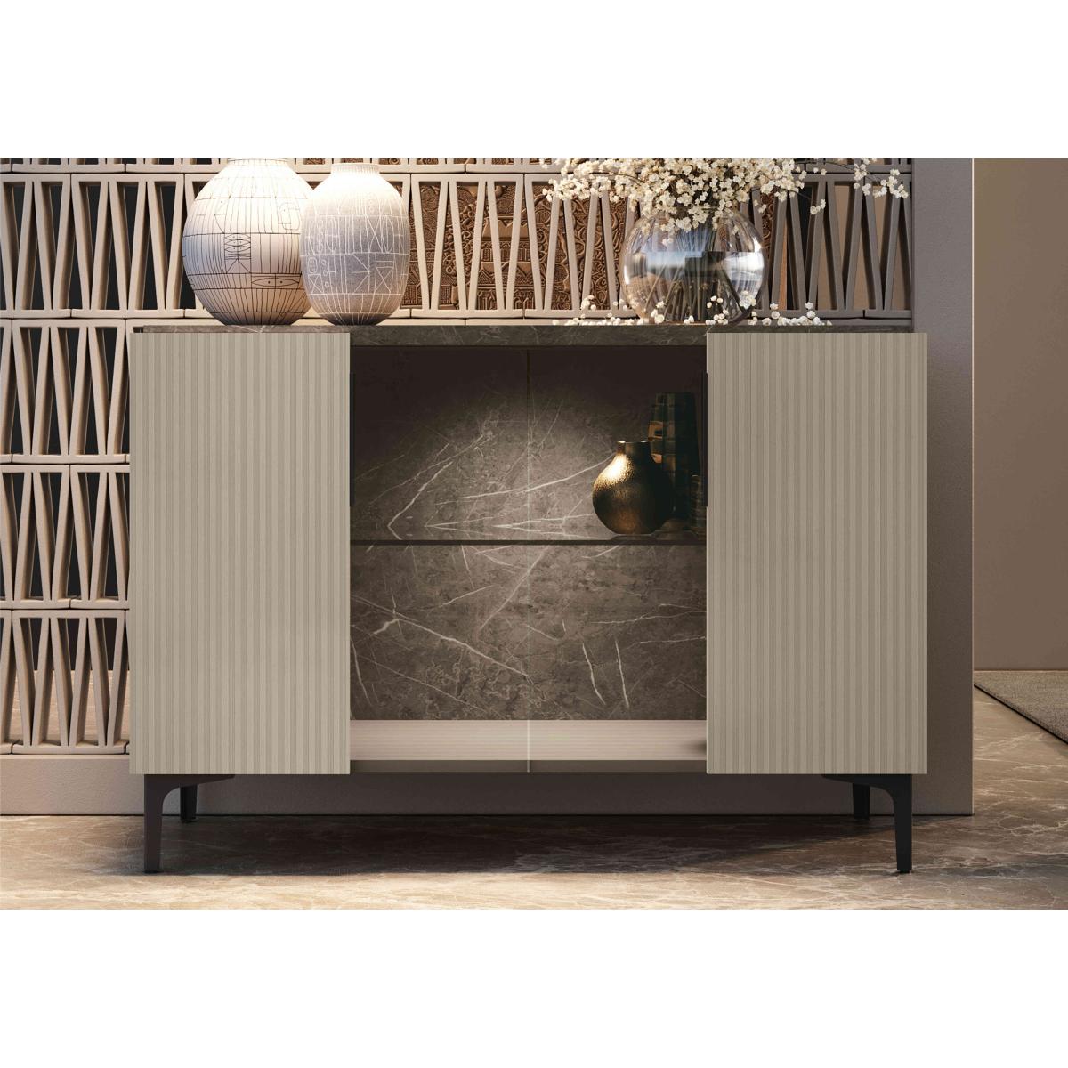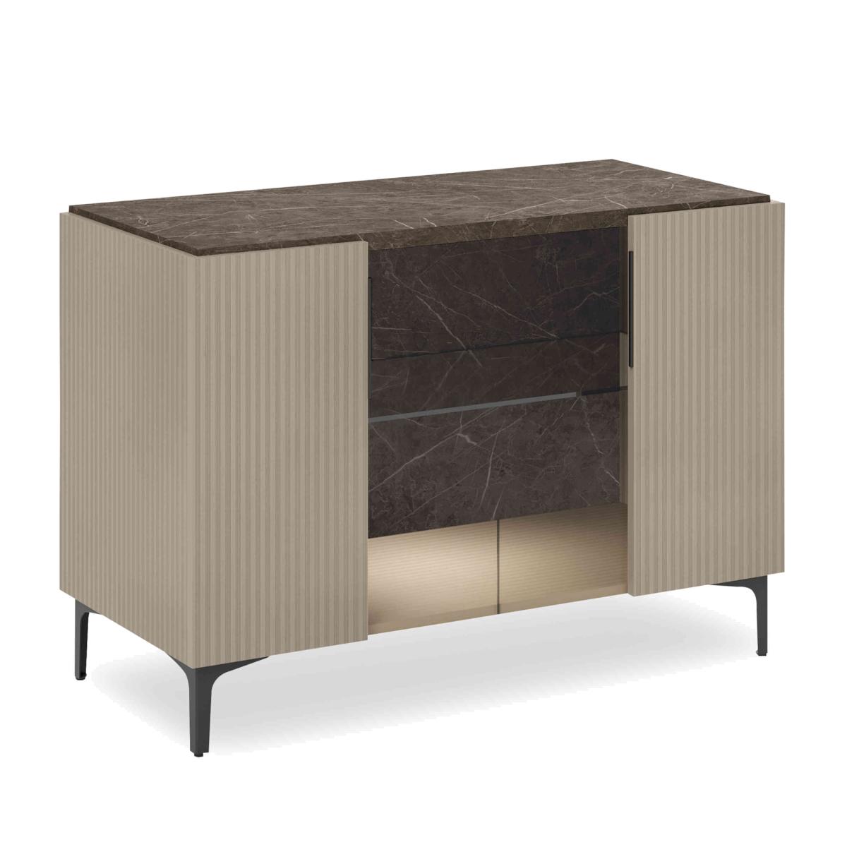 Modern glam style. Flawless finishes. Creative design. And exclusive to Furniture Village. Our Lusso collection offers distinctive and beautifully crafted furniture for living rooms and dining rooms that will elevate the look of your home for years to come. The collection includes extending dining tables, dining sets and storage furniture for both living and dining spaces. Pieces feature beautiful high-gloss marble-patterned lacquered surfaces with contrasting contemporary textured wood for the dining tables’ pedestal bases and the frames and doors of storage pieces. The Lusso range is designed and made in Italy and is only available at Furniture Village. This stunning two-door sideboard rewrites the rules on glam storage furniture with its high-gloss marbled finish and combination of open and closed storage space. Why you'll love it Stunning modern glam style, direct from Italy to Furniture Village. Beautiful sideboard has an elegant marble-effect top and interior. Perfectly smooth finish is the result of a precise four-layer lacquering process. Built-in LED lighting. Wood frame and doors have a grooved surface with a sophisticated matt finish. Stylish spaces for storage and display. Made in Italy and only at Furniture Village. This 2-door sideboard is part of the Lusso range. What you need to know Open and closed storage with 1 glass shelf. Please note that the lacquered finish may show surface scratches under certain lighting. While durable, this sideboard’s finish is not heat resistant or heatproof. Do not use abrasive cleaning products. Use coasters and placemats at all times. Browse the complete Lusso range for extraordinary living and dining room furniture. WARNING!