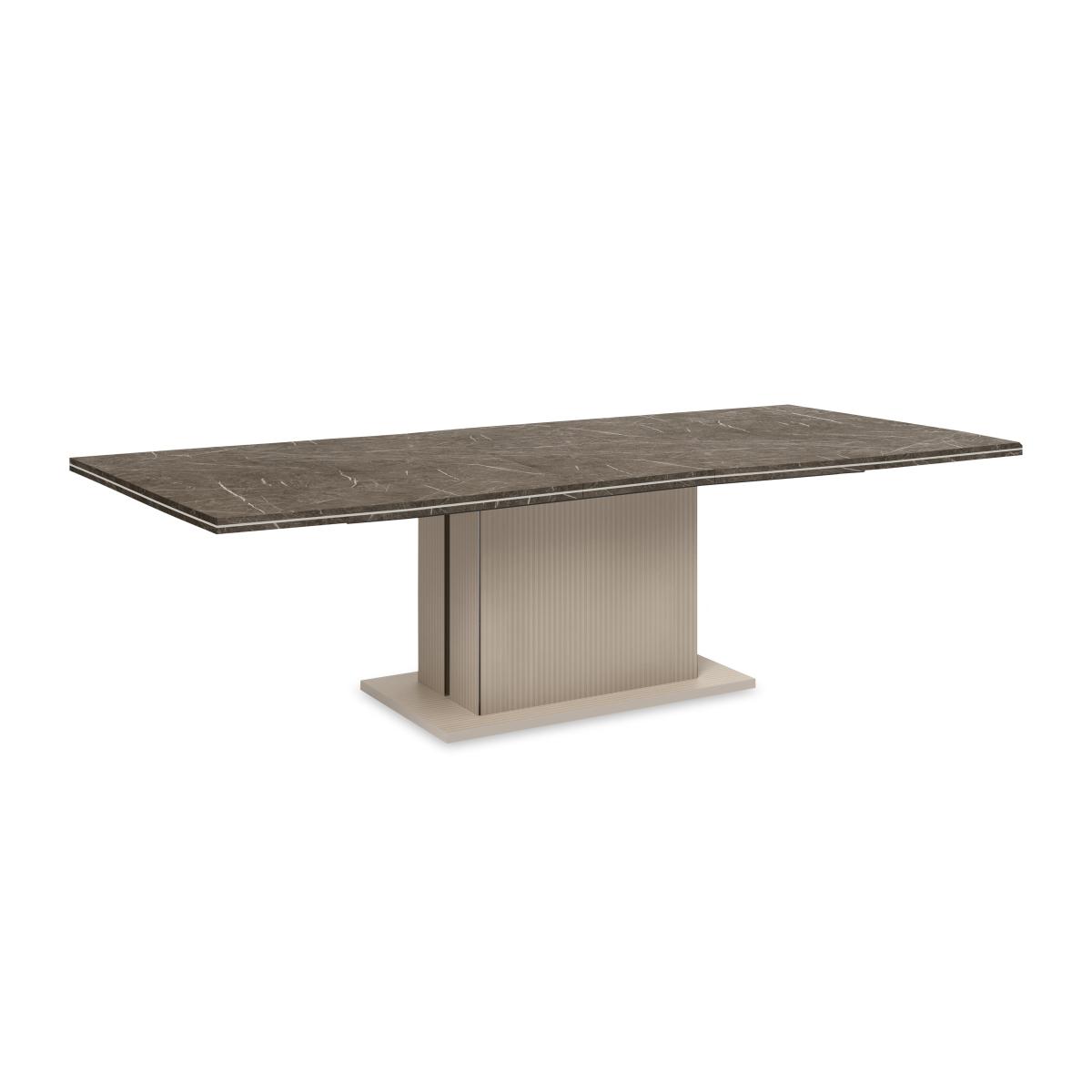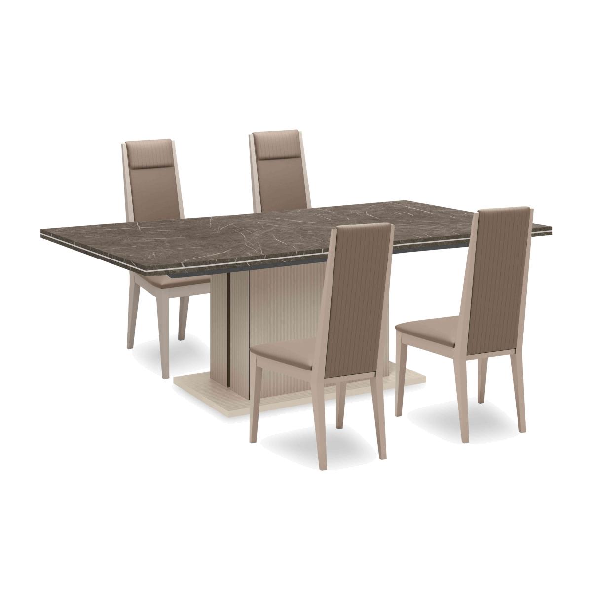 Modern glam style. Flawless finishes. Creative design. And exclusive to Furniture Village. Our Lusso collection offers distinctive and beautifully crafted furniture for living rooms and dining rooms that will elevate the look of your home for years to come. The collection includes extending dining tables, dining sets and storage furniture for both living and dining spaces. Pieces feature beautiful high-gloss marble-patterned lacquered surfaces with contrasting contemporary textured wood for the dining tables’ pedestal bases and the frames and doors of storage pieces. The Lusso range is designed and made in Italy and is only available at Furniture Village. We’ve paired our large Lusso extending dining table with a set of four elegant faux leather dining chairs – and the result is simply the definition of modern glam style. Made in Italy. Why you'll love it Stunning modern glam style, direct from Italy to Furniture Village. The beautiful extending dining table has an elegant marble-effect top. Its perfectly smooth high-gloss finish is the result of a precise four-layer lacquering process. Wood pedestal base has a grooved surface with a sophisticated matt finish. With a super-smooth sliding extension mechanism and 1 extra leaf. The extra leaf stores neatly within the table when not in use. An additional leaf is available separately. With 4 of the range’s elegant formal dining chairs. Chairs have solid wood legs and frames with a matt finish. Incredibly comfortable – high backs, sumptuous cushioning and extra head and neck support. Upholstered in a taupe faux leather. Made in Italy and only at Furniture Village. Compact dining room? Choose a dining set with the range’s small extending dining table. This dining set is part of the Lusso range. What you need to know Chairs are cushioned with foam. Solid beech frames and legs. This extending dining table can accommodate 2 extension leaves. One leaf is supplied with the table and one can be purchased separately. Table seats 8 closed, 10 when extended with 1 extra leaf (included), and 12 when extended with 2 extra leaves. Please note that the lacquered finish may show surface scratches under certain lighting. While durable, this table’s finish is not heat resistant or heatproof. Do not use abrasive cleaning products. Use coasters and placemats at all times. Browse the complete Lusso range for extraordinary living and dining room furniture.
