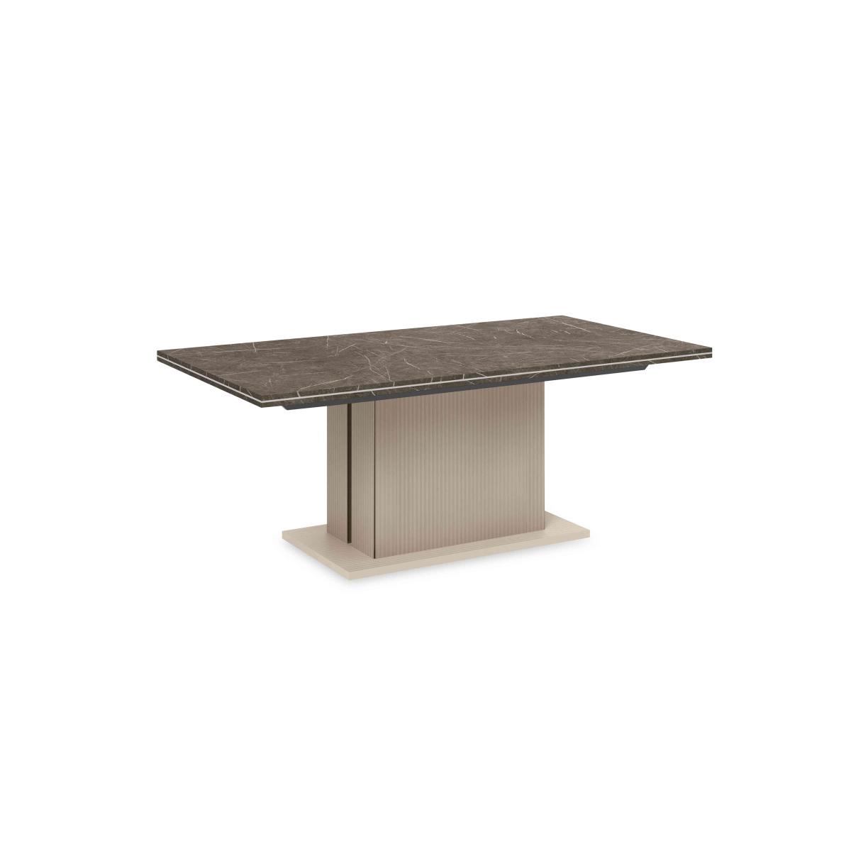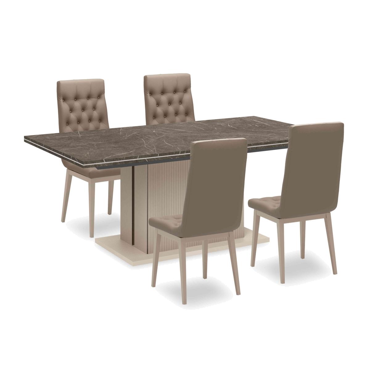 Modern glam style. Flawless finishes. Creative design. And exclusive to Furniture Village. Our Lusso collection offers distinctive and beautifully crafted furniture for living rooms and dining rooms that will elevate the look of your home for years to come. The collection includes extending dining tables, dining sets and storage furniture for both living and dining spaces. Pieces feature beautiful high-gloss marble-patterned lacquered surfaces with contrasting contemporary textured wood for the dining tables’ pedestal bases and the frames and doors of storage pieces. The Lusso range is designed and made in Italy and is only available at Furniture Village. This glam and gorgeous dining set features a high-gloss marble-effect extending dining table that seats 10. We’ve paired it with four buttoned dining chairs. Made in Italy. Why you'll love it Stunning modern glam style, direct from Italy to Furniture Village. The beautiful extending dining table has an elegant marble-effect top. Its perfectly smooth high-gloss finish is the result of a precise four-layer lacquering process. Wood pedestal base has a grooved surface with a sophisticated matt finish. With a super-smooth sliding extension mechanism and 1 extra leaf. The extra leaf stores neatly within the table when not in use. An additional leaf is available separately. With 4 of the range’s luxurious dining chairs. Chairs have sumptuous cushioning and solid wood legs with a matt finish. Lavish buttoning completes the look. Upholstered in a taupe faux leather. Made in Italy and only at Furniture Village. More guests to entertain? Choose a dining set with the range’s large extending dining table. This dining set is part of the Lusso range. What you need to know Chairs are cushioned with foam. Solid beech legs. This extending dining table can accommodate 2 extension leaves. One leaf is supplied with the table and one can be purchased separately. Table seats 6 closed, 8 when extended with 1 extra leaf (included), and 10 when extended with 2 extra leaves. Please note that the lacquered finish may show surface scratches under certain lighting. While durable, this table’s finish is not heat resistant or heatproof. Do not use abrasive cleaning products. Use coasters and placemats at all times. Browse the complete Lusso range for extraordinary living and dining room furniture.