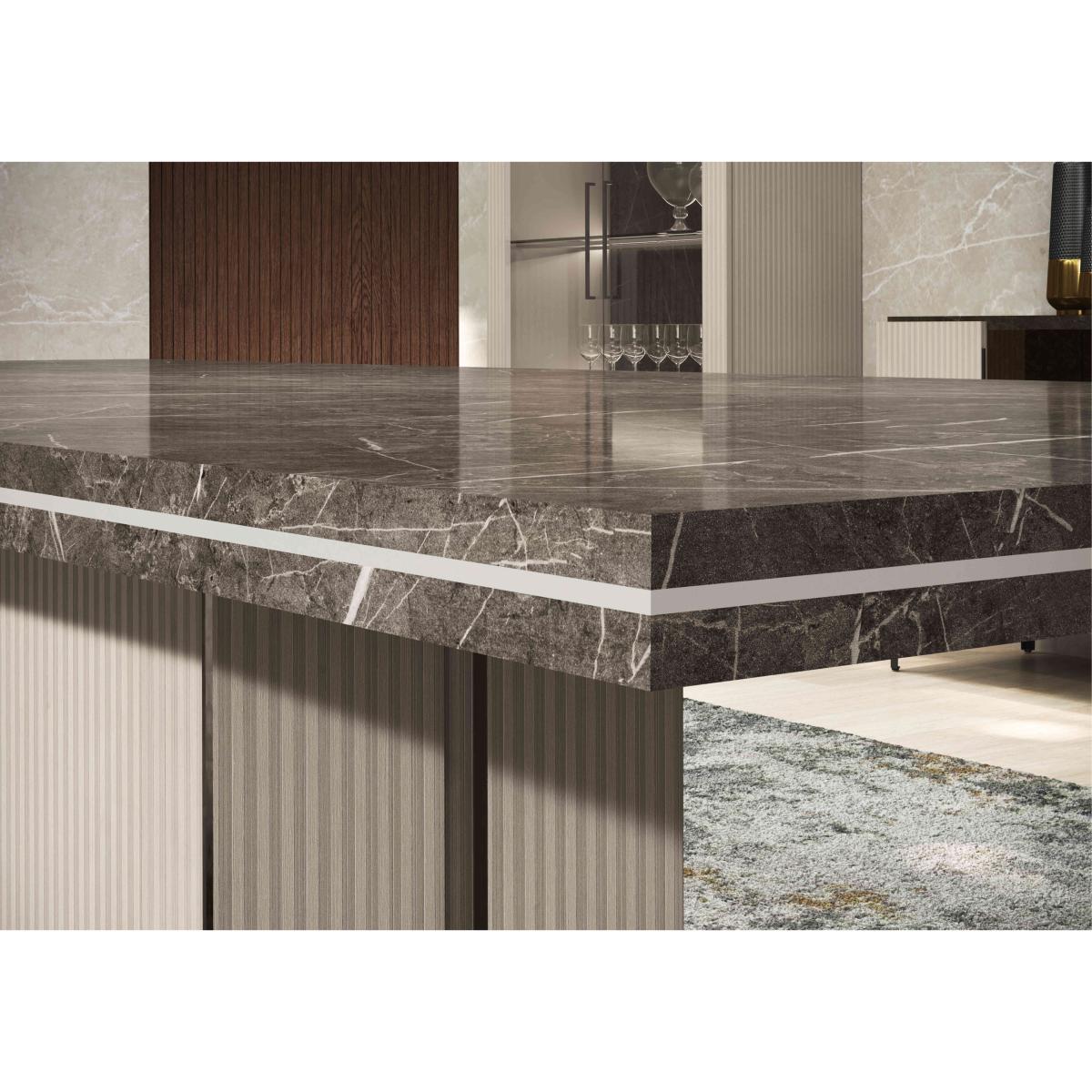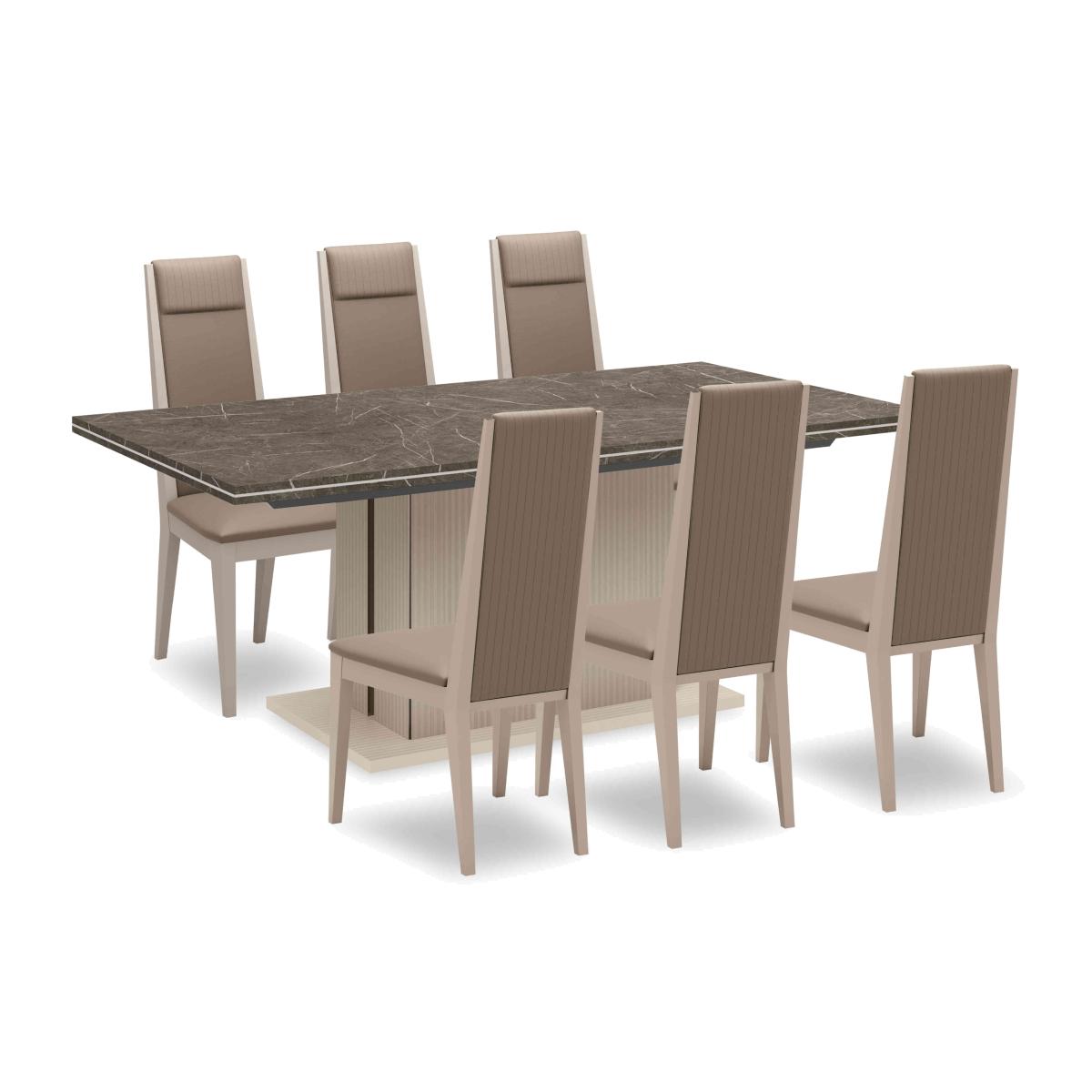 Modern glam style. Flawless finishes. Creative design. And exclusive to Furniture Village. Our Lusso collection offers distinctive and beautifully crafted furniture for living rooms and dining rooms that will elevate the look of your home for years to come. The collection includes extending dining tables, dining sets and storage furniture for both living and dining spaces. Pieces feature beautiful high-gloss marble-patterned lacquered surfaces with contrasting contemporary textured wood for the dining tables’ pedestal bases and the frames and doors of storage pieces. The Lusso range is designed and made in Italy and is only available at Furniture Village. It’s the combination of luxe finishes – high-gloss, marble patterning and textured wood – that make this extending dining table so striking. This dining set includes six faux leather-upholstered chairs. Why you'll love it Stunning modern glam style, direct from Italy to Furniture Village. The beautiful extending dining table has an elegant marble-effect top. Its perfectly smooth high-gloss finish is the result of a precise four-layer lacquering process. Wood pedestal base has a grooved surface with a sophisticated matt finish. With a super-smooth sliding extension mechanism and 1 extra leaf. The extra leaf stores neatly within the table when not in use. An additional leaf is available separately. With 6 of the range’s elegant formal dining chairs. Chairs have solid wood legs and frames with a matt finish. Incredibly comfortable – high backs, sumptuous cushioning and extra head and neck support. Upholstered in a taupe faux leather. Made in Italy and only at Furniture Village. More guests to entertain? Choose a dining set with the range’s large extending dining table. This dining set is part of the Lusso range. What you need to know Chairs are cushioned with foam. Solid beech frames and legs. This extending dining table can accommodate 2 extension leaves. One leaf is supplied with the table and one can be purchased separately. Table seats 6 closed, 8 when extended with 1 extra leaf (included), and 10 when extended with 2 extra leaves. Please note that the lacquered finish may show surface scratches under certain lighting. While durable, this table’s finish is not heat resistant or heatproof. Do not use abrasive cleaning products. Use coasters and placemats at all times. Browse the complete Lusso range for extraordinary living and dining room furniture.