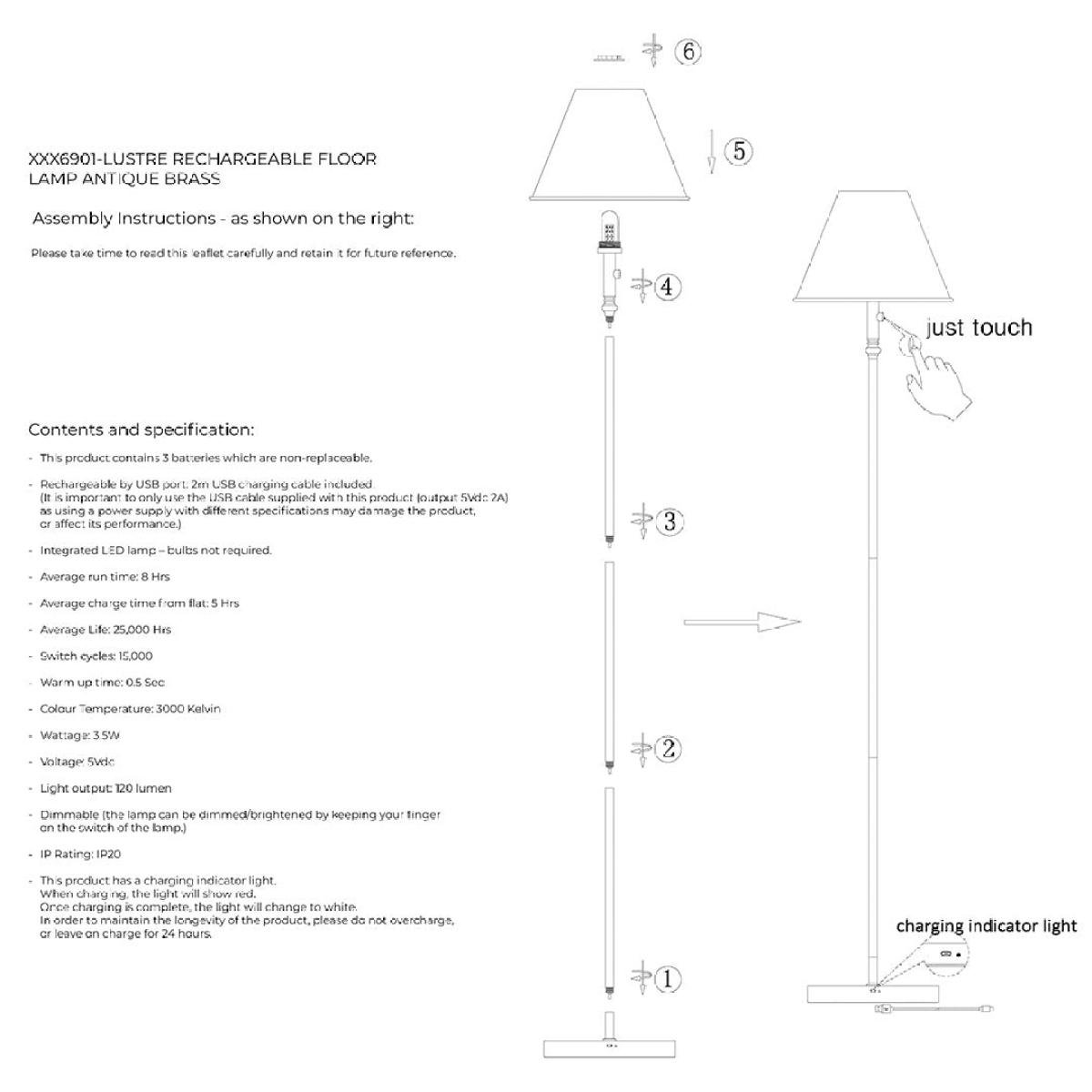 Lustre LED rechargeable floor lamp, featuring an antique brass finish, a USB charging cable and a dimming function. Experience modern convenience with the Lustre LED rechargeable floor lamp, a perfect blend of style and functionality. Featuring a warm antique brass finish, this lamp adds a touch of contemporary elegance to any space. Designed with versatility in mind, it includes a USB charging cable for easy recharging. With a dimming function, you can adjust the light to create the perfect atmosphere - just hold the button and the light will fade up and down.. The lamp charges fully in just 5 hours and provides an average of 8 hours of continuous light per charge, offering flexibility and portability without the need for a constant power connection. The Lustre floor lamp is ideal for any room where convenience meets stylish lighting solutions. Pairs with the Lustre antique brass table lamp. Lustre LED rechargeable floor lamp, featuring an antique brass finish, a USB charging cable and a dimming function. Experience modern convenience with the Lustre LED rechargeable floor lamp, a perfect blend of style and functionality. Featuring a warm antique brass finish, this lamp adds a touch of contemporary elegance to any space. Designed with versatility in mind, it includes a USB charging cable for easy recharging. With a dimming function, you can adjust the light to create the perfect atmosphere - just hold the button and the light will fade up and down.. The lamp charges fully in just 5 hours and provides an average of 8 hours of continuous light per charge, offering flexibility and portability without the need for a constant power connection. The Lustre floor lamp is ideal for any room where convenience meets stylish lighting solutions. Pairs with the Lustre antique brass table lamp.