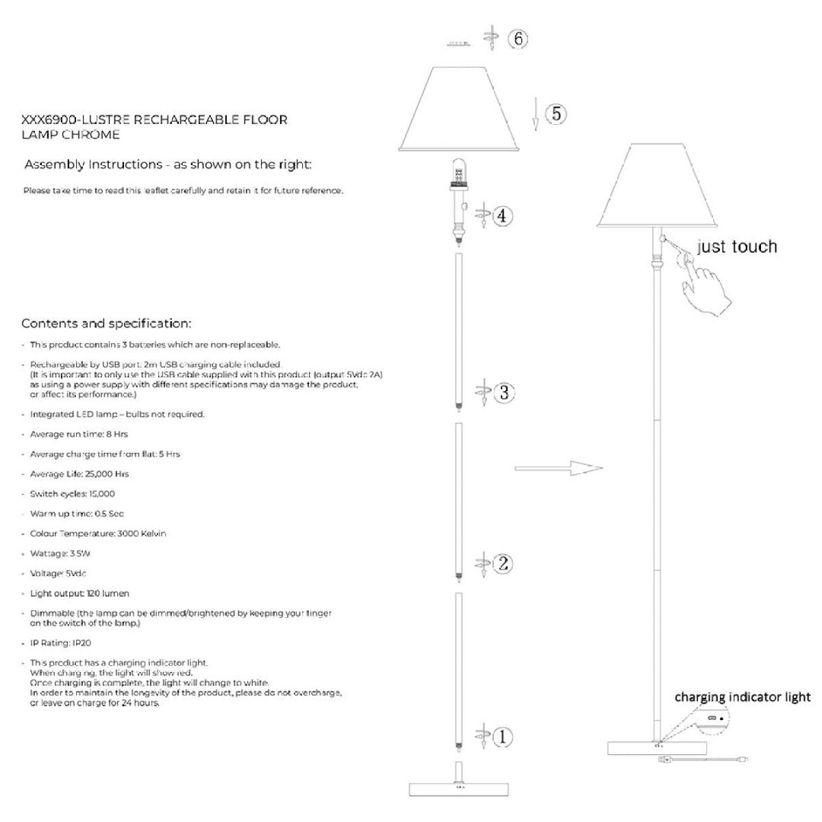 Lustre LED rechargeable floor lamp, featuring a polished chrome finish, a USB charging cable and a dimming function. Experience modern convenience with the Lustre LED rechargeable floor lamp, a perfect blend of style and functionality. Featuring a stylish polished chrome finish, this lamp adds a touch of contemporary elegance to any space. Designed with versatility in mind, it includes a USB charging cable for easy recharging. With a dimming function, you can adjust the light to create the perfect atmosphere - just hold the button and the light will fade up and down.. The lamp charges fully in just 5 hours and provides an average of 8 hours of continuous light per charge, offering flexibility and portability without the need for a constant power connection. The Lustre floor lamp is ideal for any room where convenience meets stylish lighting solutions. Pairs with the Lustre polished chrome table lamp. Lustre LED rechargeable floor lamp, featuring a polished chrome finish, a USB charging cable and a dimming function. Experience modern convenience with the Lustre LED rechargeable floor lamp, a perfect blend of style and functionality. Featuring a stylish polished chrome finish, this lamp adds a touch of contemporary elegance to any space. Designed with versatility in mind, it includes a USB charging cable for easy recharging. With a dimming function, you can adjust the light to create the perfect atmosphere - just hold the button and the light will fade up and down.. The lamp charges fully in just 5 hours and provides an average of 8 hours of continuous light per charge, offering flexibility and portability without the need for a constant power connection. The Lustre floor lamp is ideal for any room where convenience meets stylish lighting solutions. Pairs with the Lustre polished chrome table lamp.