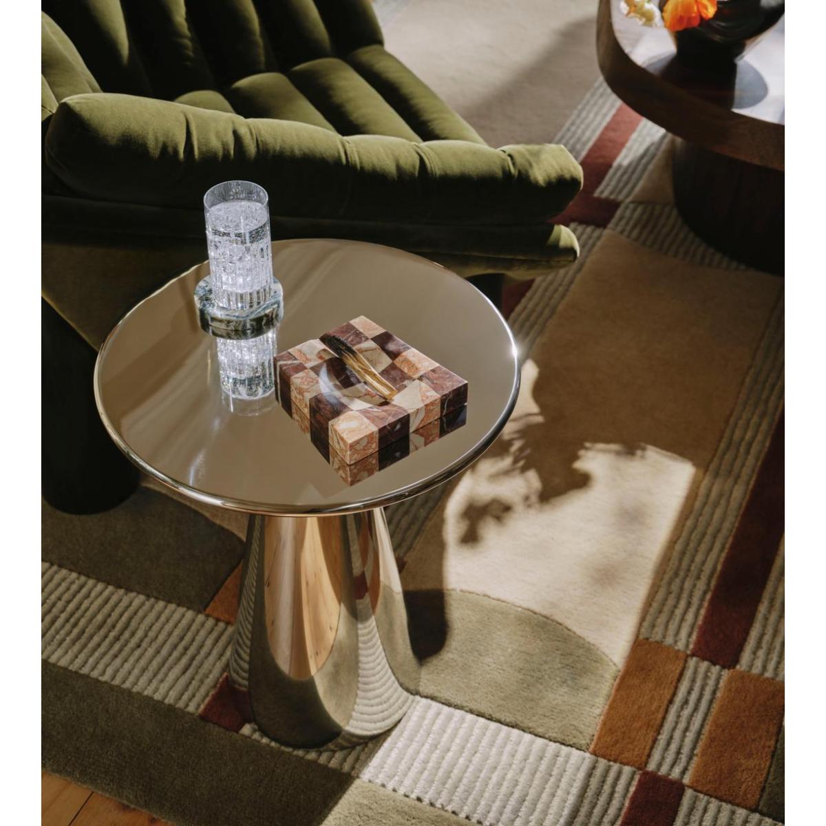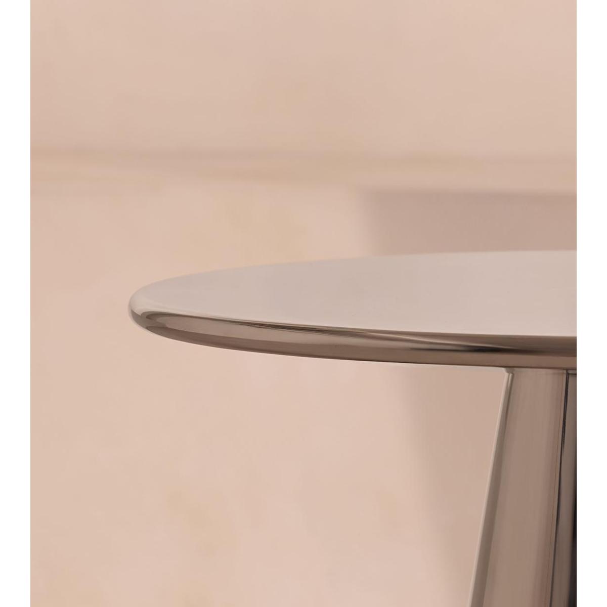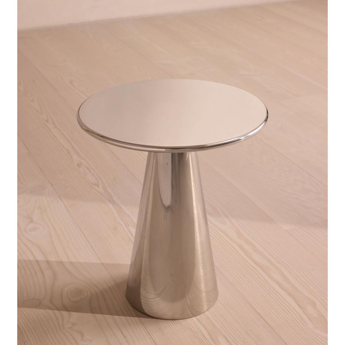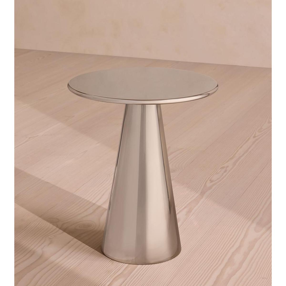 A sculptural silhouette made entirely from highly polished stainless steel for a mirrored finish. The sleek, circular top of our Lustro side table rests seamlessly on a conical base to create a sculptural silhouette. Drawing inspiration from Chicago's The Bean, a highly polished finish on the stainless steel creates a mirror-like look.