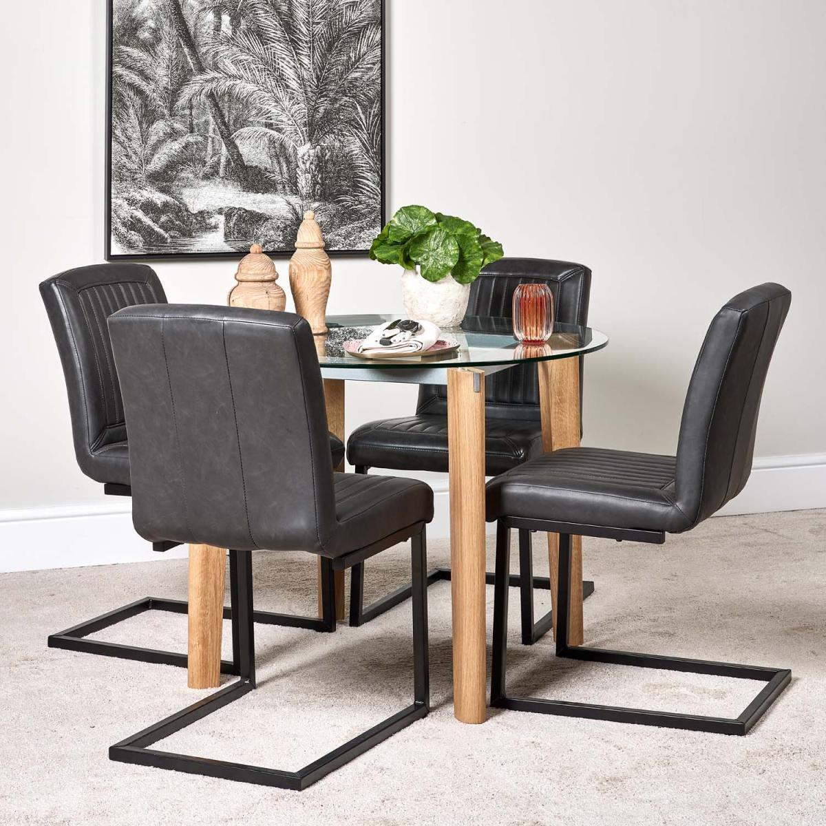 The Lutina small round glass dining table is luxurious alternative to a wood dining table. Topped with a thick glass surface, and supported by wood-effect foil wrapped legs that are inlayed below the surface with brushed steel brackets, the round glass table is both intricate and sturdy. With subtle industrial appeal, this small round glass dining table is a great on trend addition to the dining room or kitchen/diner. The curved black metal legs give these vintage dining chairs a floating effect that's a great fit for modern interiors and the style conscious. Upholstered in faux leather for a uniform look when tucked away under a dining table.