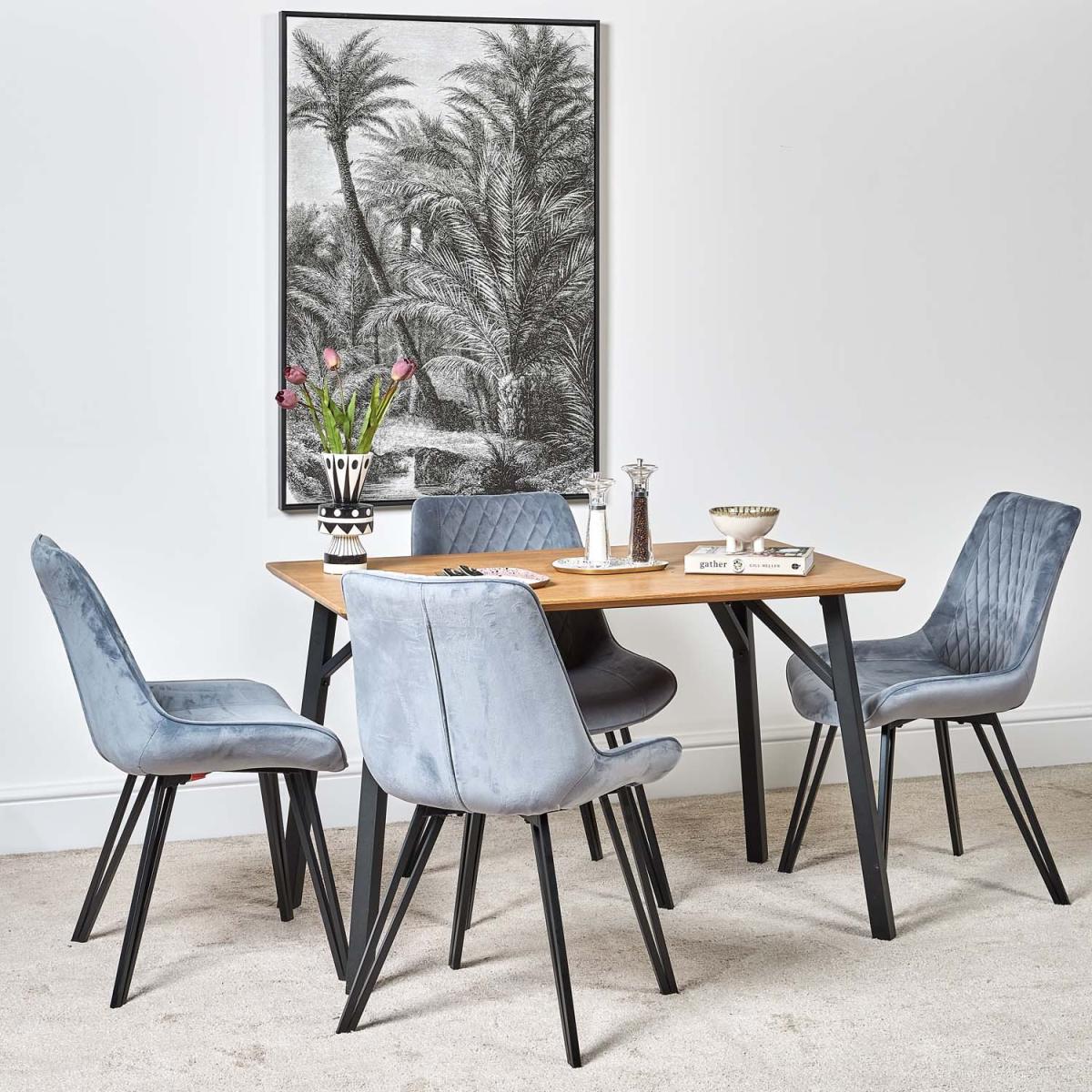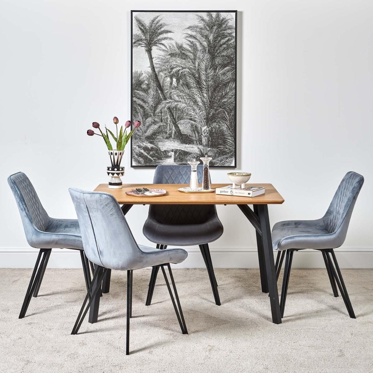The Lutina Dining Table is an alternative to the round table in the same range. The table is a great size to sit four diners comfortably, and is supported by industrial style metal powder coated legs. The top is an oak-effect paperfoil surface which is easy to keep clean and durable. The stylish Chase light grey velvet dining chairs feature a slightly bucketed seat with quilted velvet upholstery, and industrial style black powder coated metal legs for support.