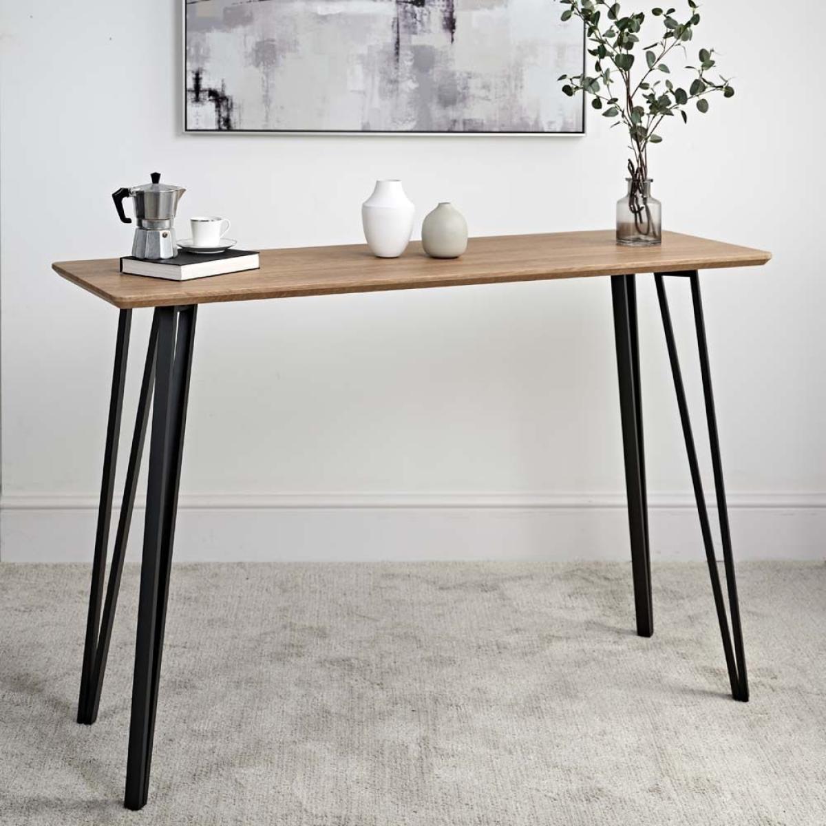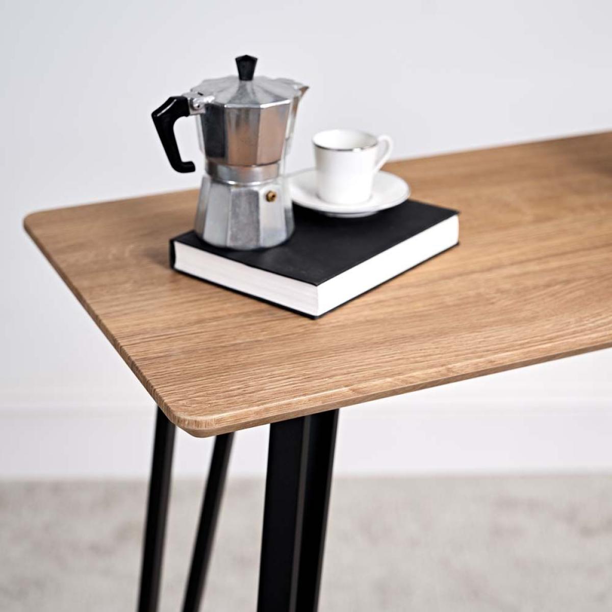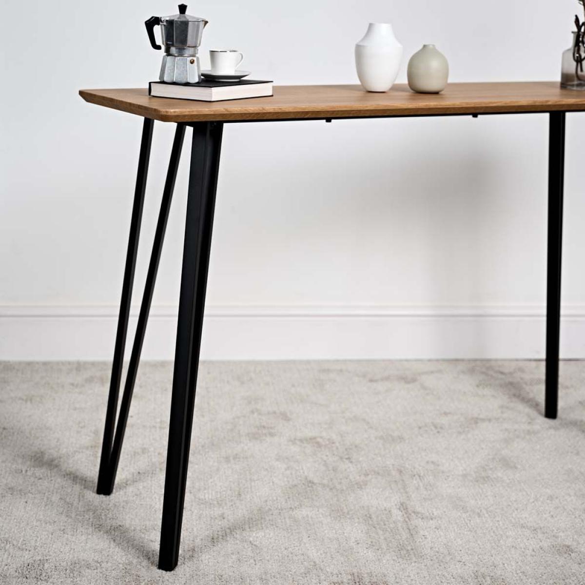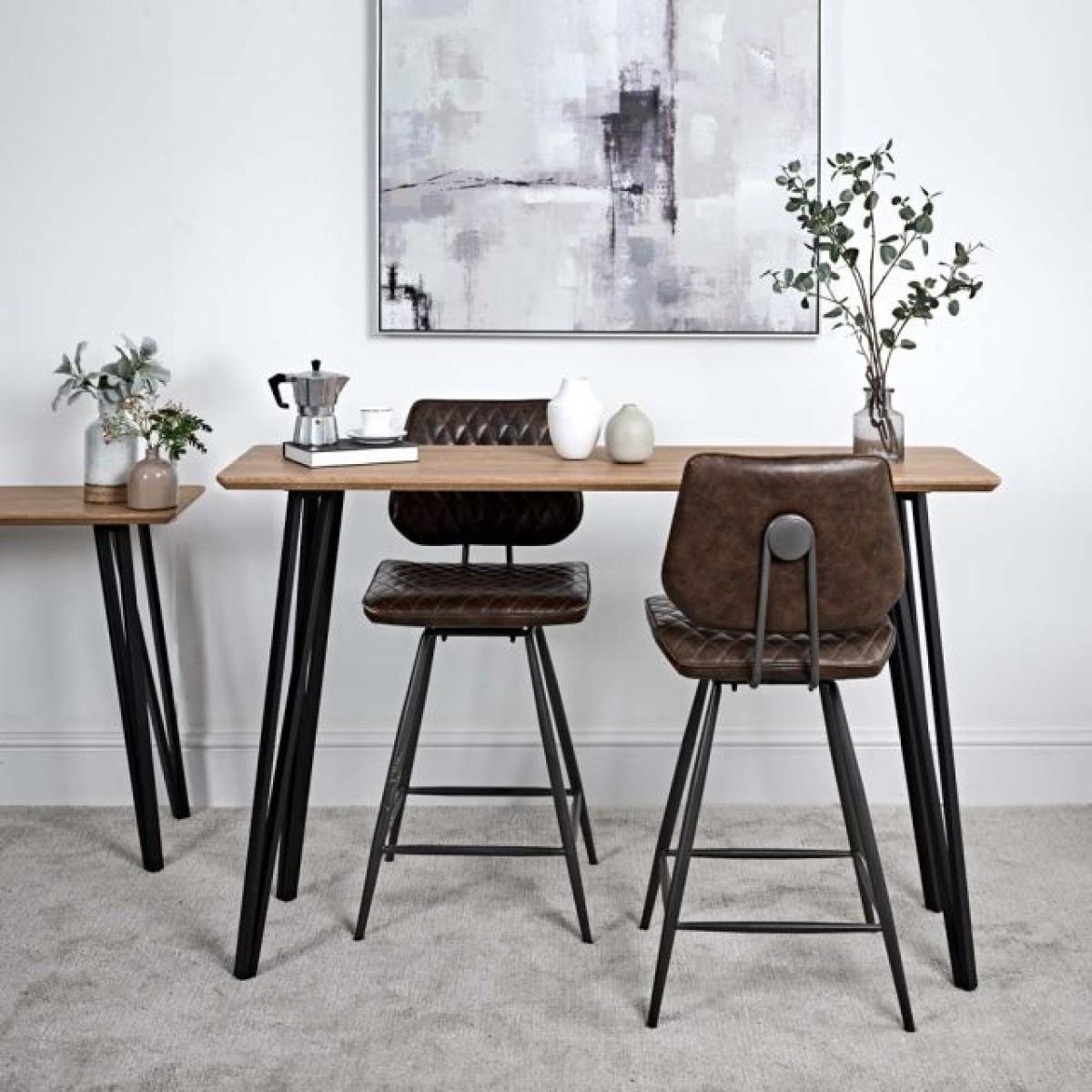 This industrial styled yet elegant bar table in our Lutina collection is a great way to support relaxed dining in the kitchen/dining room without the need for a fitted breakfast bar. It's black metal leg design paired with the foil wrapped wood effect top are a great combination. Perfect for a surface for quick breakie!.