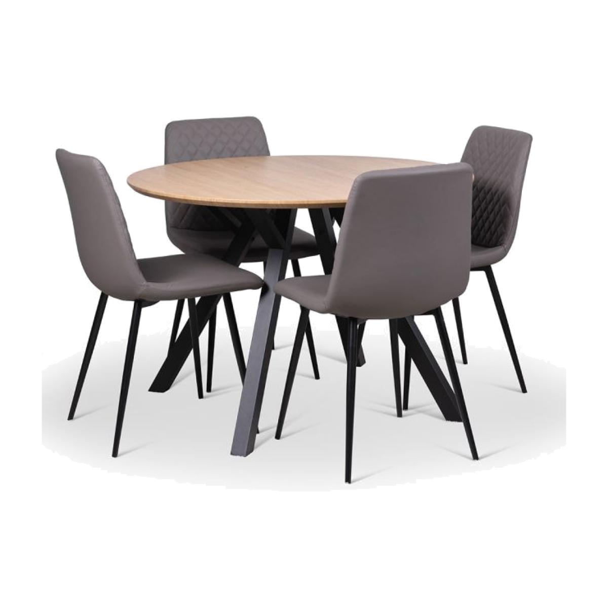Bring industrial character to your dining room with this combination bundle of our Lutina Round Dining Table and four Ripley Dining Chairs in Truffle. The table perfectly proportioned and the top is finished with a textured oak effect foil for high durability and easy cleaning. The modern Ripley chairs are upholstered in a faux leather fabric with diamond quilted back detail and sit on top of matt black metal legs.