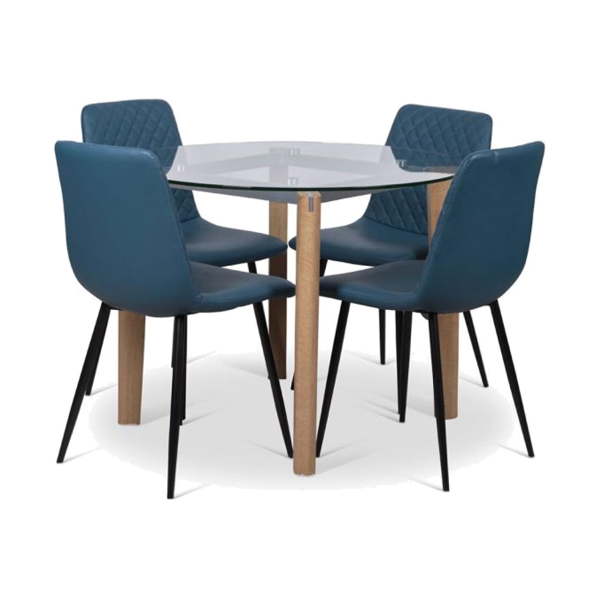 Make a change from traditional wood top dining tables with our Lutina Round Glass Dining Table and four Ripley Dining Chairs in Teal. The table is luxurious alternative to wood and perfectly proportioned with its thick glass surface. Supported by wood effect foil wrapped legs this table is both intricate and sturdy. Paired with four Ripley chairs, upholstered in a faux leather fabric with diamond quilted back detail and sitting on top of matt black metal legs.