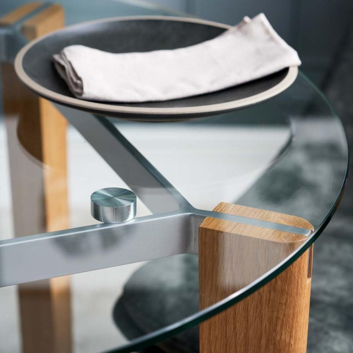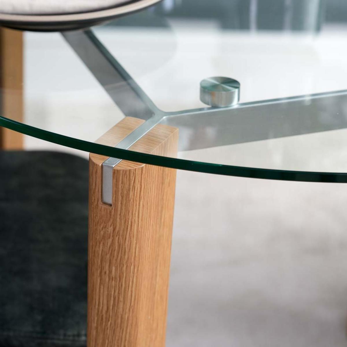 The Lutina small round glass dining table is luxurious alternative to a wood dining table. Topped with a thick glass surface, and supported by wood-effect foil wrapped legs that are inlayed below the surface with brushed steel brackets, the round glass table is both intricate and sturdy. With subtle industrial appeal, this small round glass dining table is a great on trend addition to the dining room or kitchendiner. Dimensions: W100 x D100 x H76 Foil wrapped wood-effect legs and brushed steel brackets. Solid toughened glass top Simple self assembly