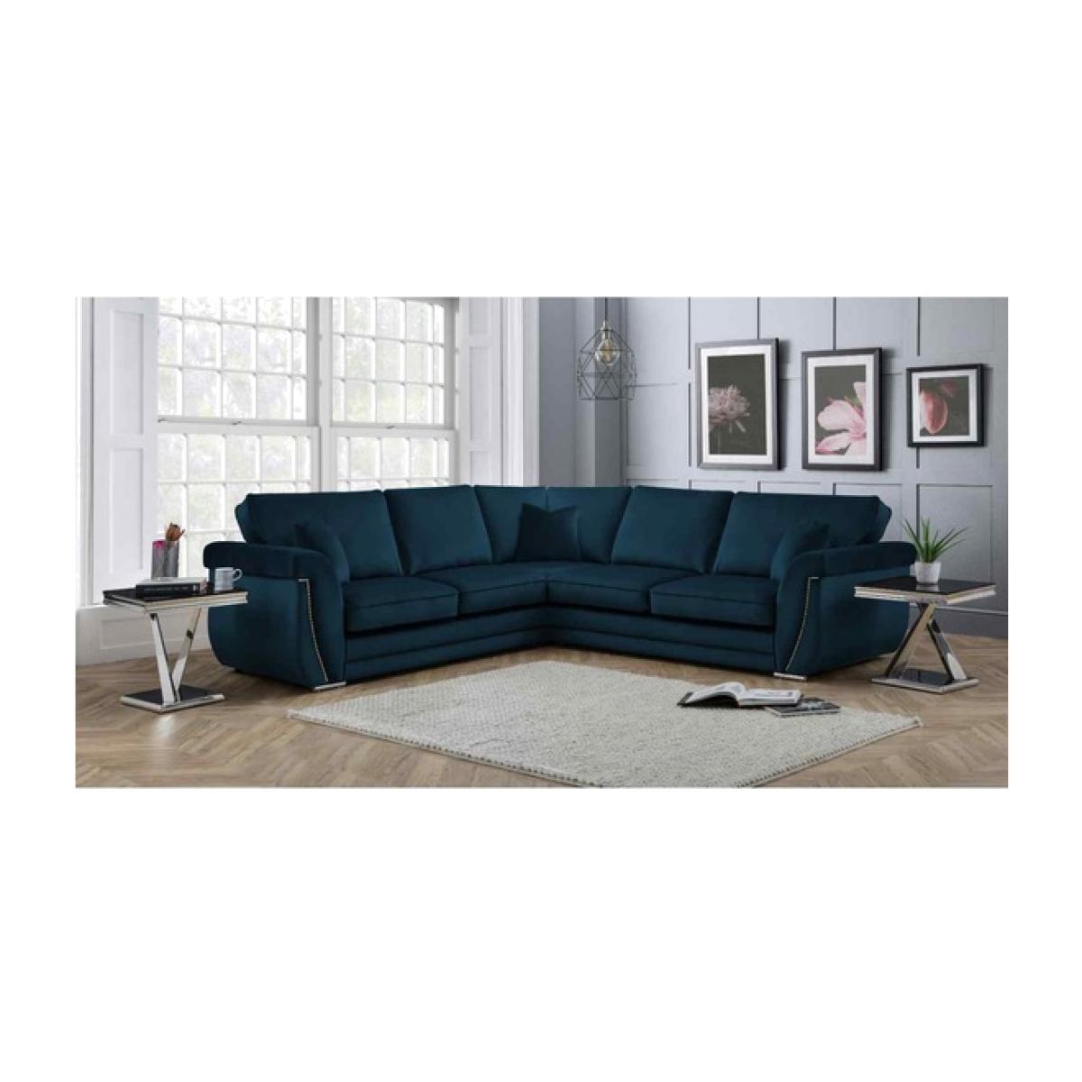 UK Made Corner Sofa, Premium plush velour fabric, this beautiful corner sofa includes a solid hardwood frame used and expert upholstery, this sofa is sure to be a crowd pleaser! 3 Scatter cushions included and finished off with stunning beading around the sofa.