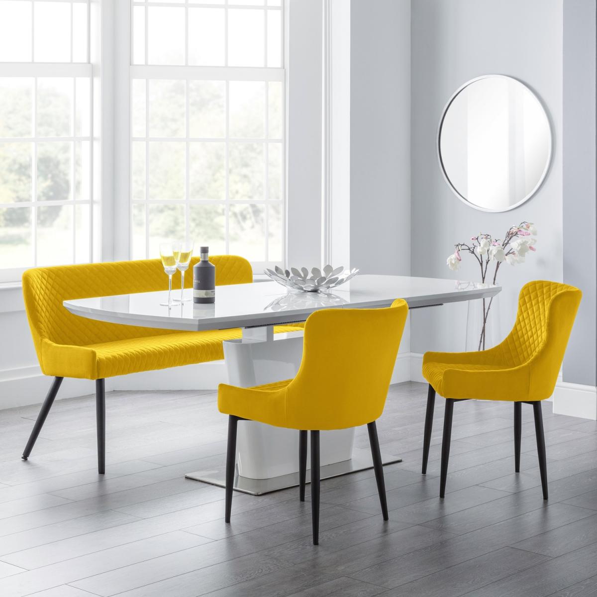 The Luxe High Back Bench offers a classic style with a modern twist, beautifully upholstered in a modern mustard velvet with a luxuriant quilted finish offering depth and texture. This bench is perfect use for dining or a striking focal point for any room.