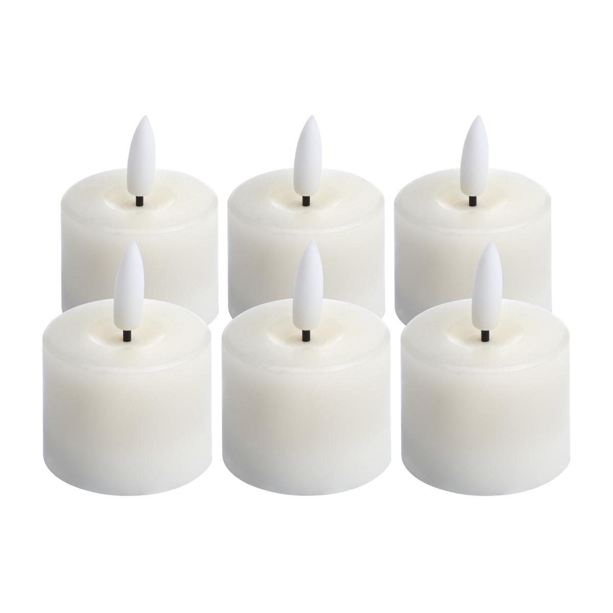 This is a battery operated tealight candle with a black wick and natural glow 'flame', which combine to give a highly realistic look when lit. As a product, it is an ideal finishing touch to any interior or venue and makes a simple yet beautiful decoration. The tealight comes in a white colour as a pack of six with an onoff switch located on the bottom of the candle. Our Luxe Collection LED candles are the safest way to create a warm atmosphere, the amber LED flame flickers gently to imitate the effect of a real flame but without the messy wax and risk of fire. This item uses a single CR2032 watch battery (included) and features a simple switch on the base for oneoff and a timer option which will turn your candle off after 6 hours.