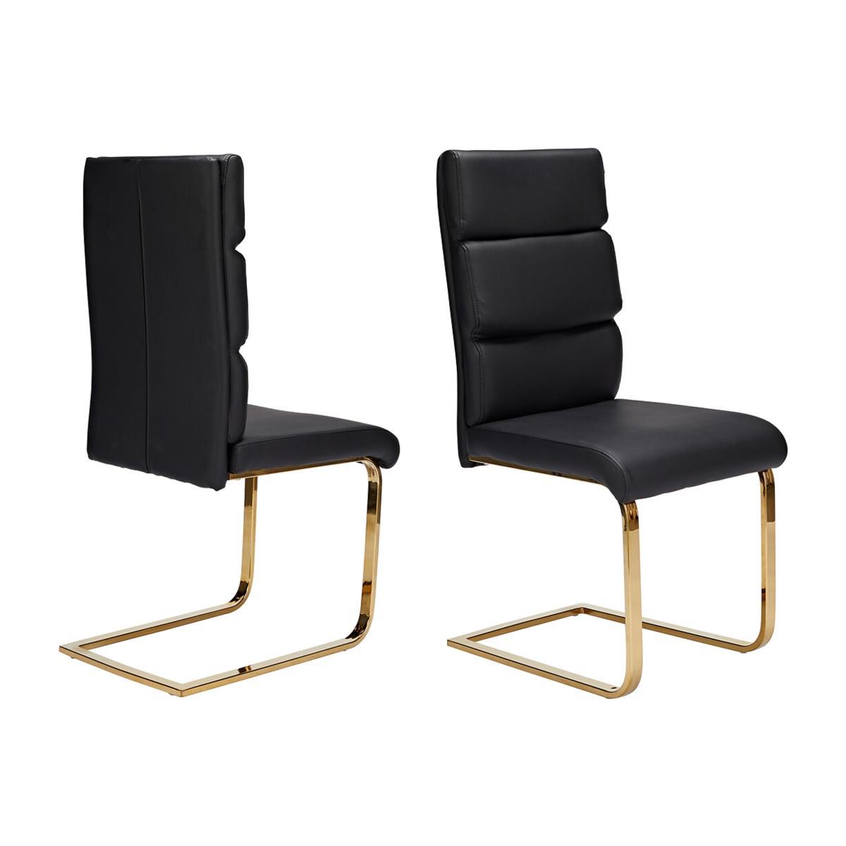 Giving your living or dining area a truly luxurious feel, these Dining Chairs will leave your home feeling more opulent and at a sensible price. Sleek black faux leather encompasses the triple cushioned back rest and padded seat. Finished with polished gold cantilever legs, these stunning chairs appear to defy gravity with their one-sided supports. Designed with such perfect balance and strong, supple materials, these stylish chairs can simultaneously hold a person comfortably and look very cool at the same time!Self Assembly Required. Product Dimensions: 64cmx43cmx95cm. Please remember to measure your available space before ordering Parcel 1 Packaged Dimensions: 70cmx 46cmx 45cm Weight: 21kg. Composition: Faux Leather and Metal This product will be dispatched by one of our trusted suppliers. You’ll be contacted by their selected courier about your delivery.