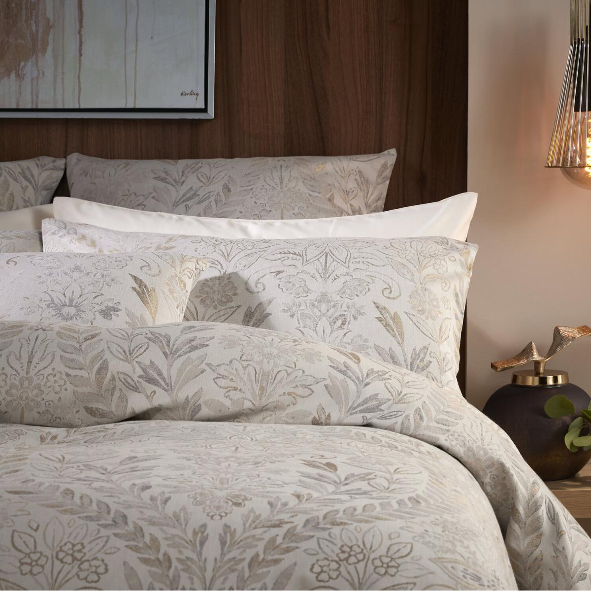 A statement damask is woven bedding set with tones of bronze, gold & Cream. This bedding set crosses from classic to contemporary & will certainly add that wow factor to your sleeping space.