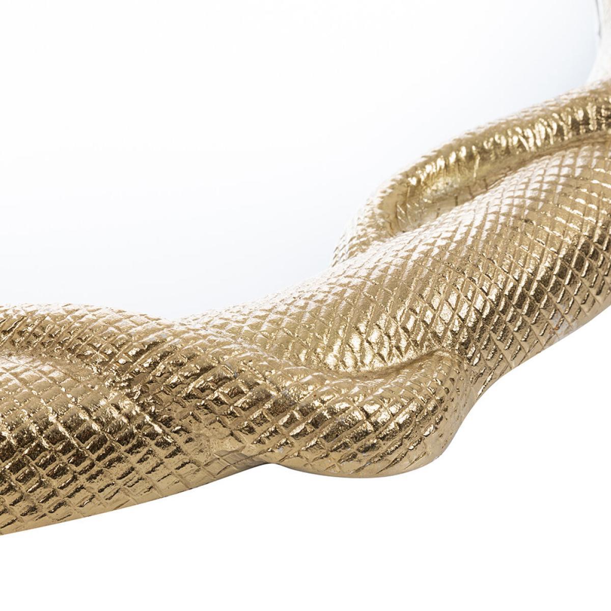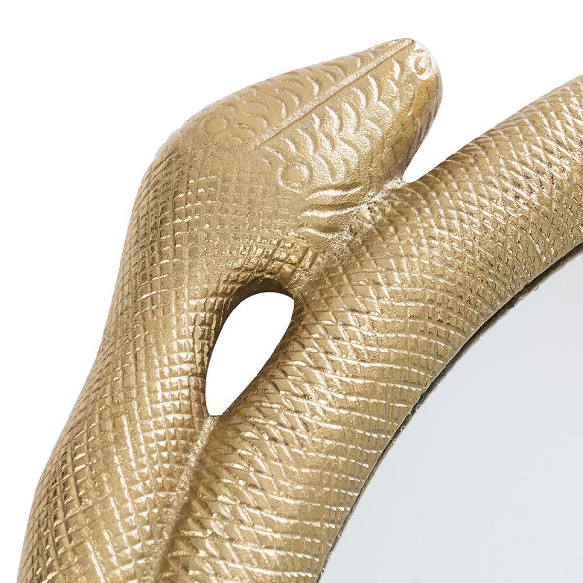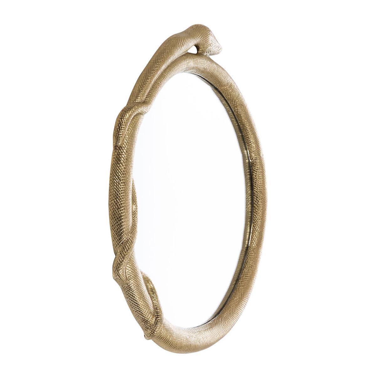Be seduced by this striking gold snake mirror from Luxe. Both decorative and functional, this large round mirror features a sculptural snake frame coiled around the mirror. Ideal for hanging above a dressssssssing table or chessssst of drawerssssss. Key features: * Round wall mirror * Material: aluminium, glass, MDF * Dimensions: W80.5xL75xD4cm * Gold colour * Textured snake frame